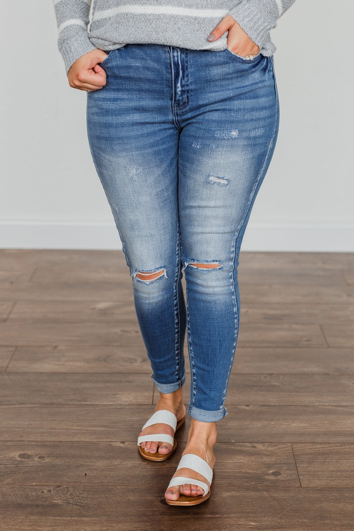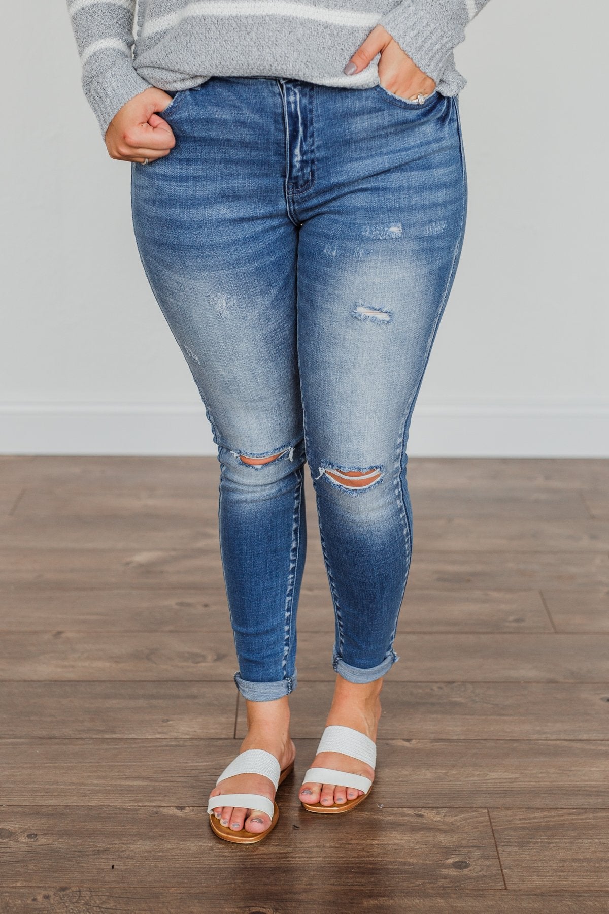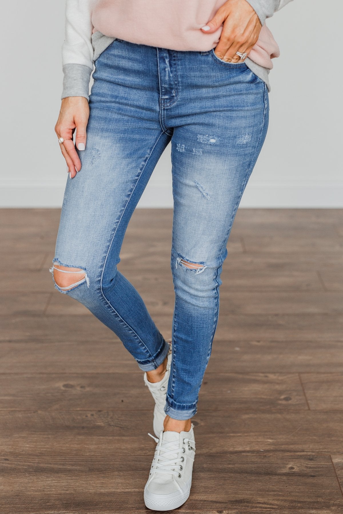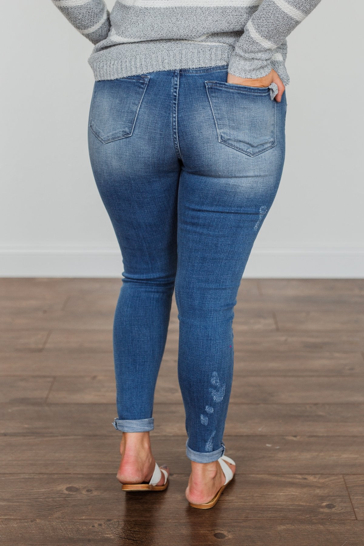 Grab these medium wash skinny jeans with distressing for an effortless way to start any day! You'll feel as cute as you look with details like the five functional pockets and very slight distressing along the thighs!
