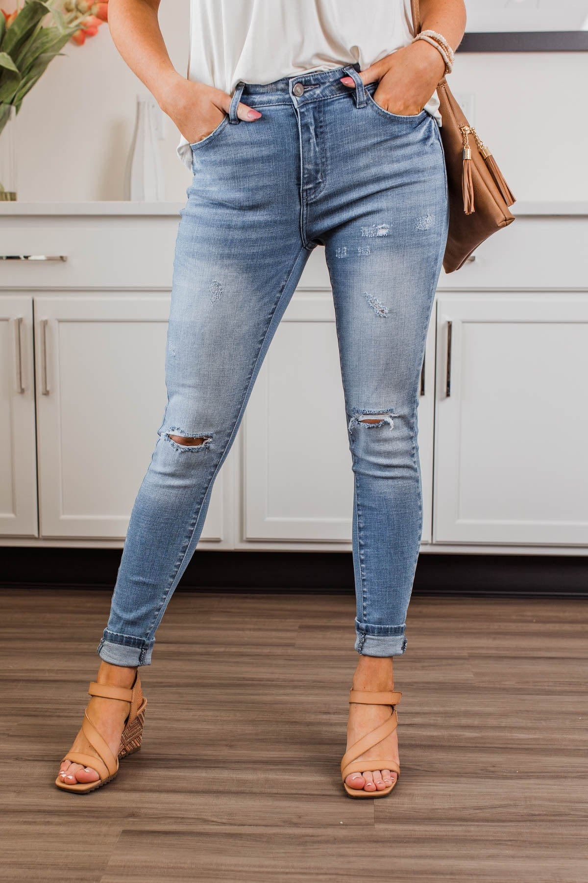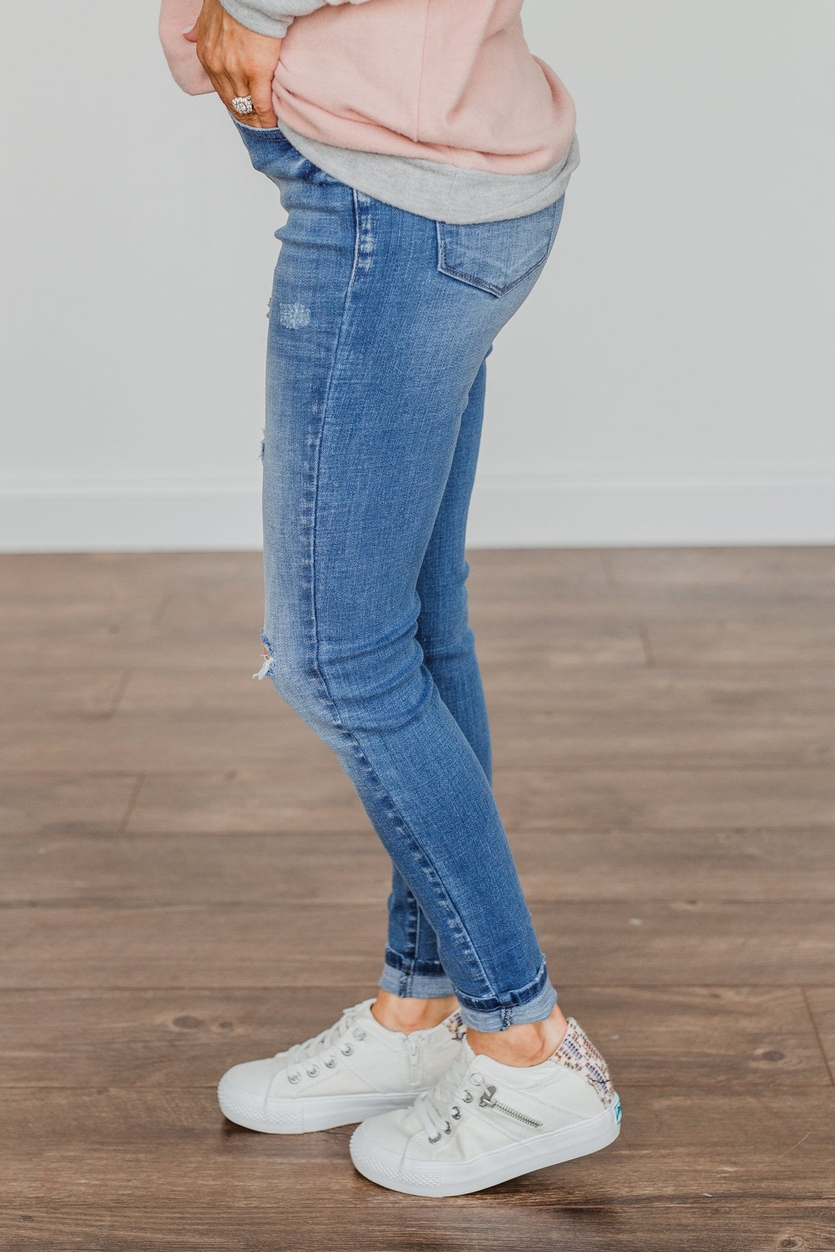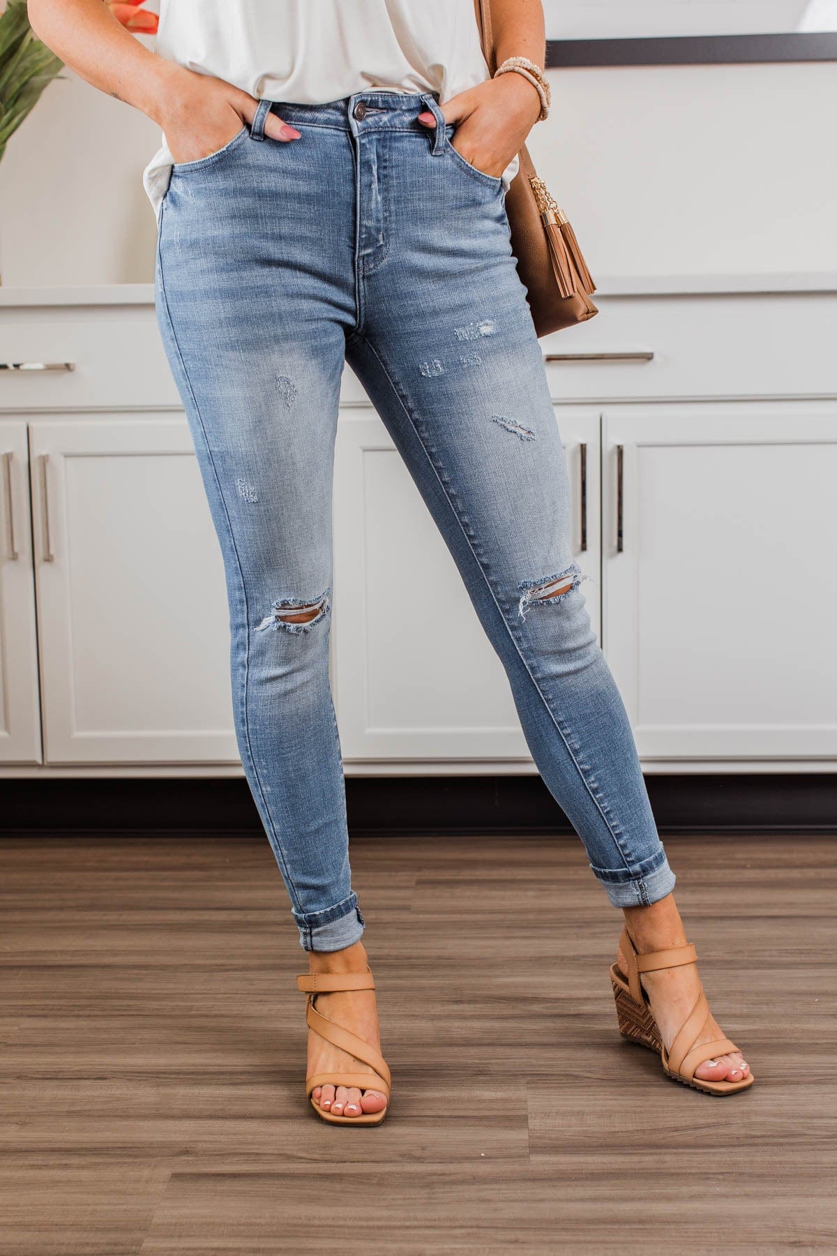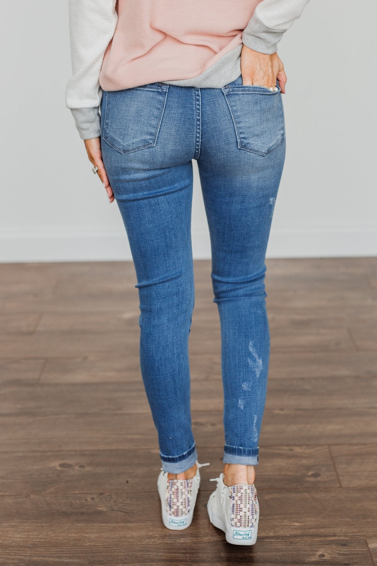 Grab these medium wash skinny jeans with distressing for an effortless way to start any day! You'll feel as cute as you look with details like the five functional pockets and very slight distressing along the thighs!