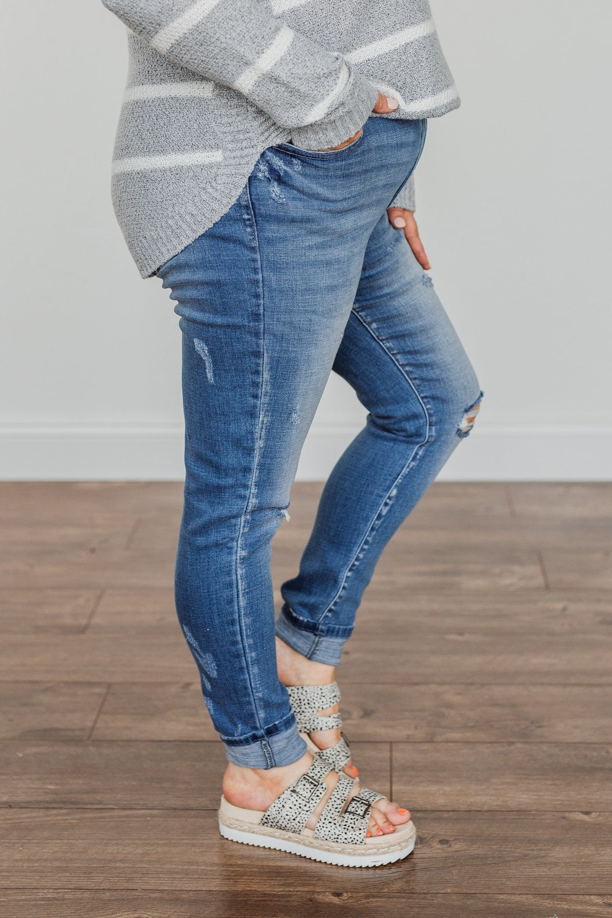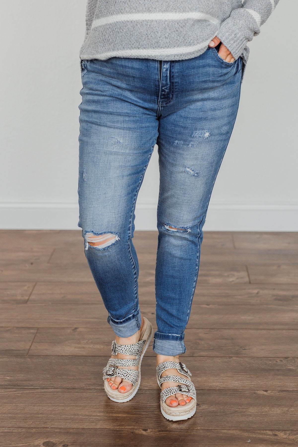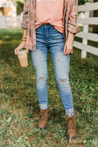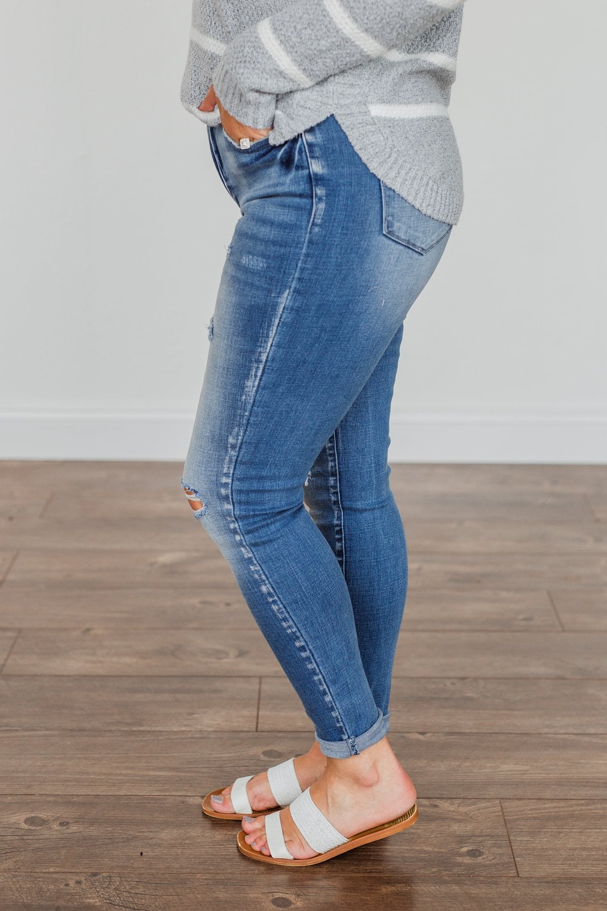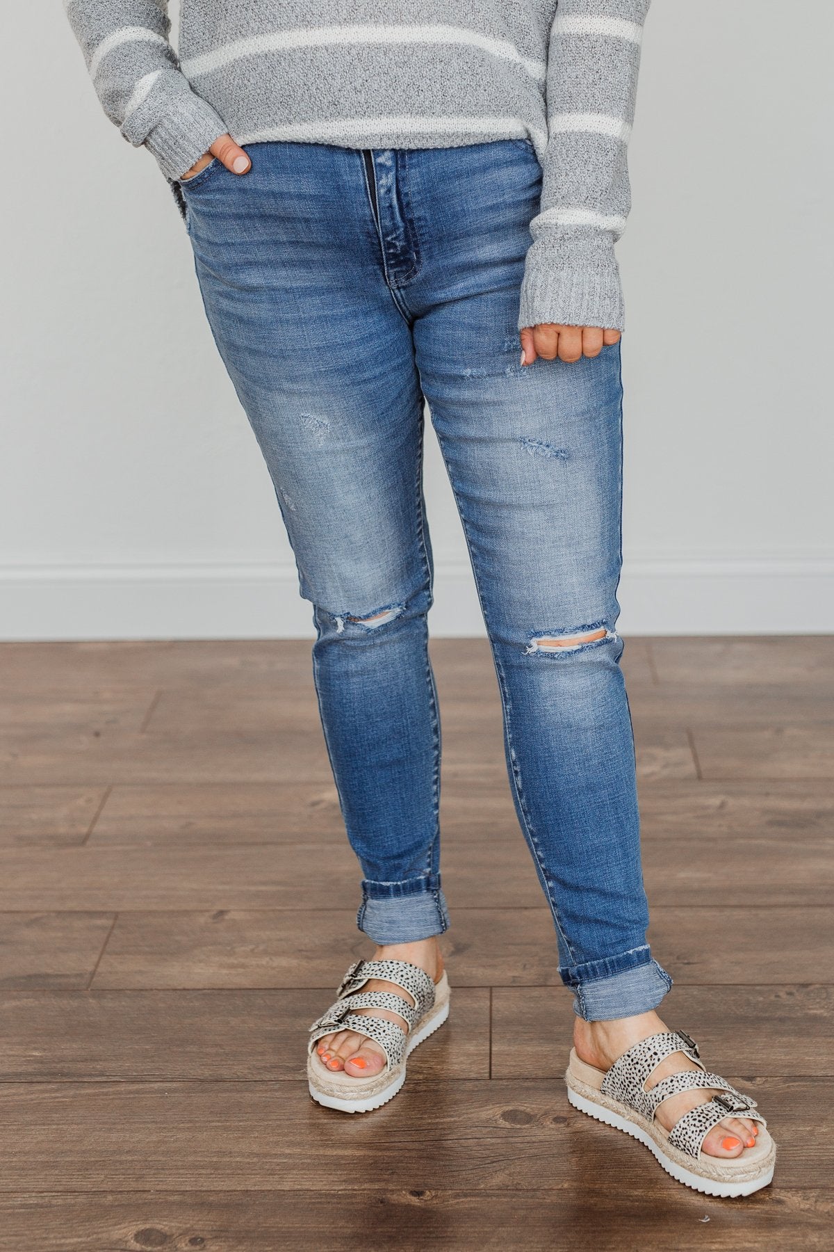 Grab these medium wash skinny jeans with distressing for an effortless way to start any day! You'll feel as cute as you look with details like the five functional pockets and very slight distressing along the thighs!