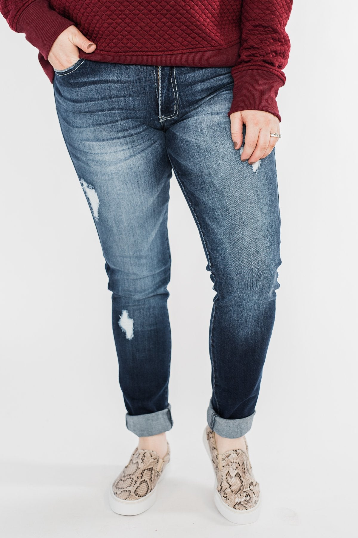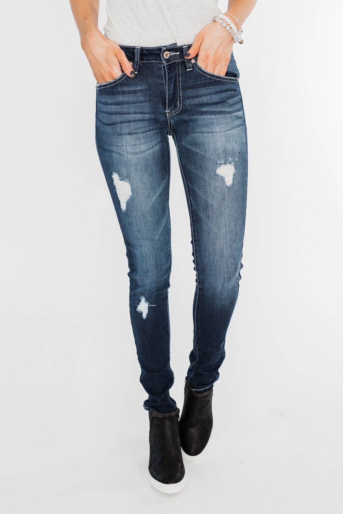 Medium-dark wash skinny jeans with slight distressing! These jeans feature slight "paint splatter" details that add a little pop to your outfit! *See images below*