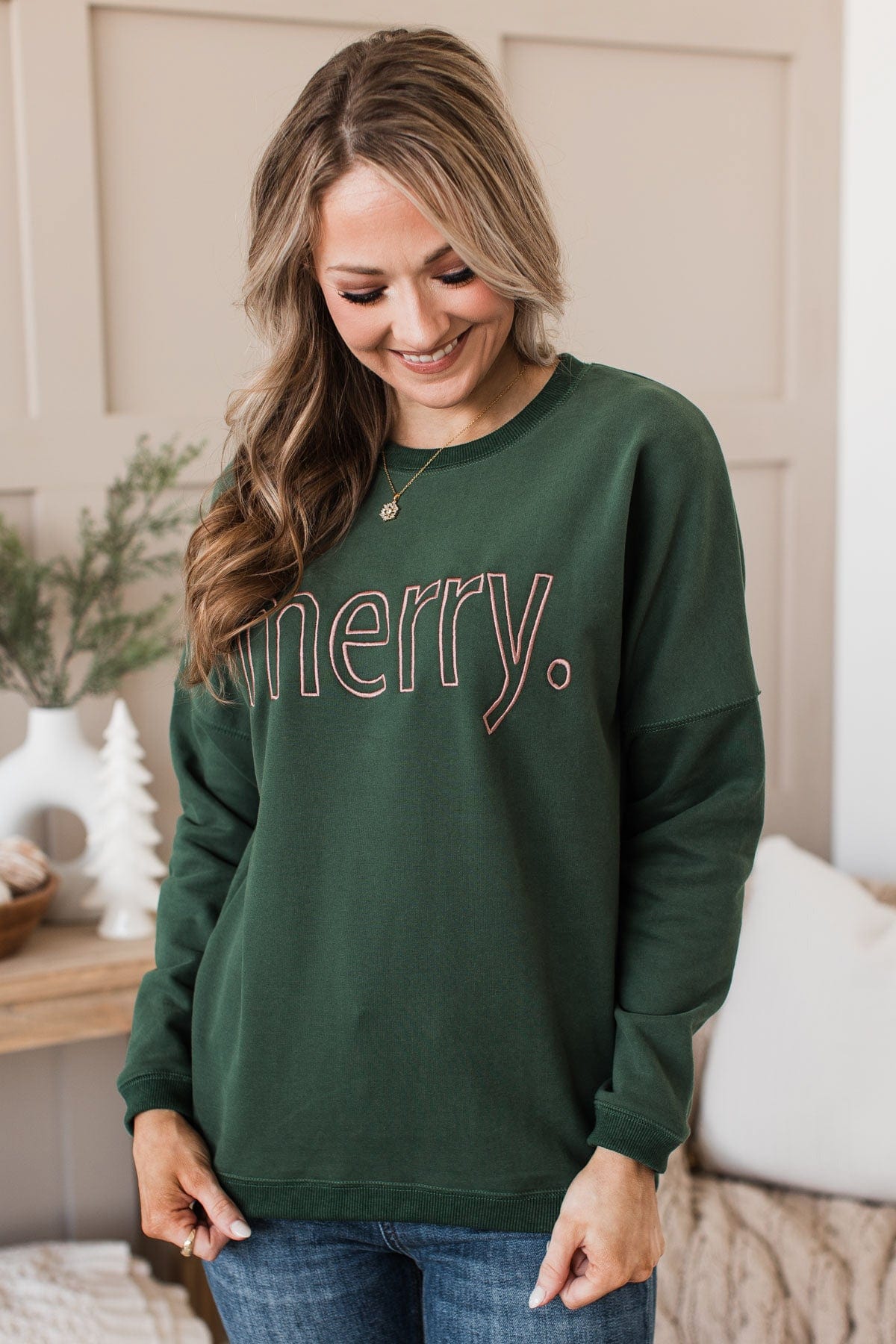 "Merry" Embroidered Crew Neck Pullover- Hunter Green