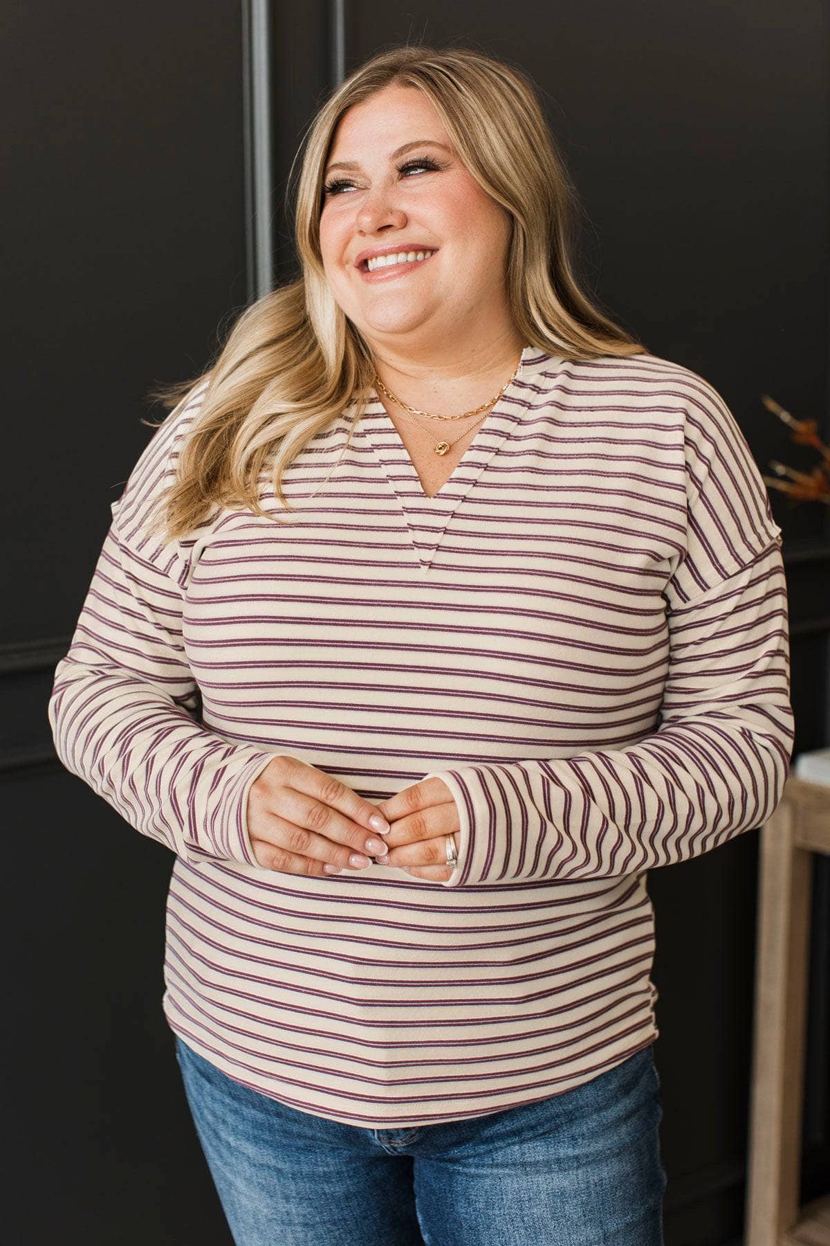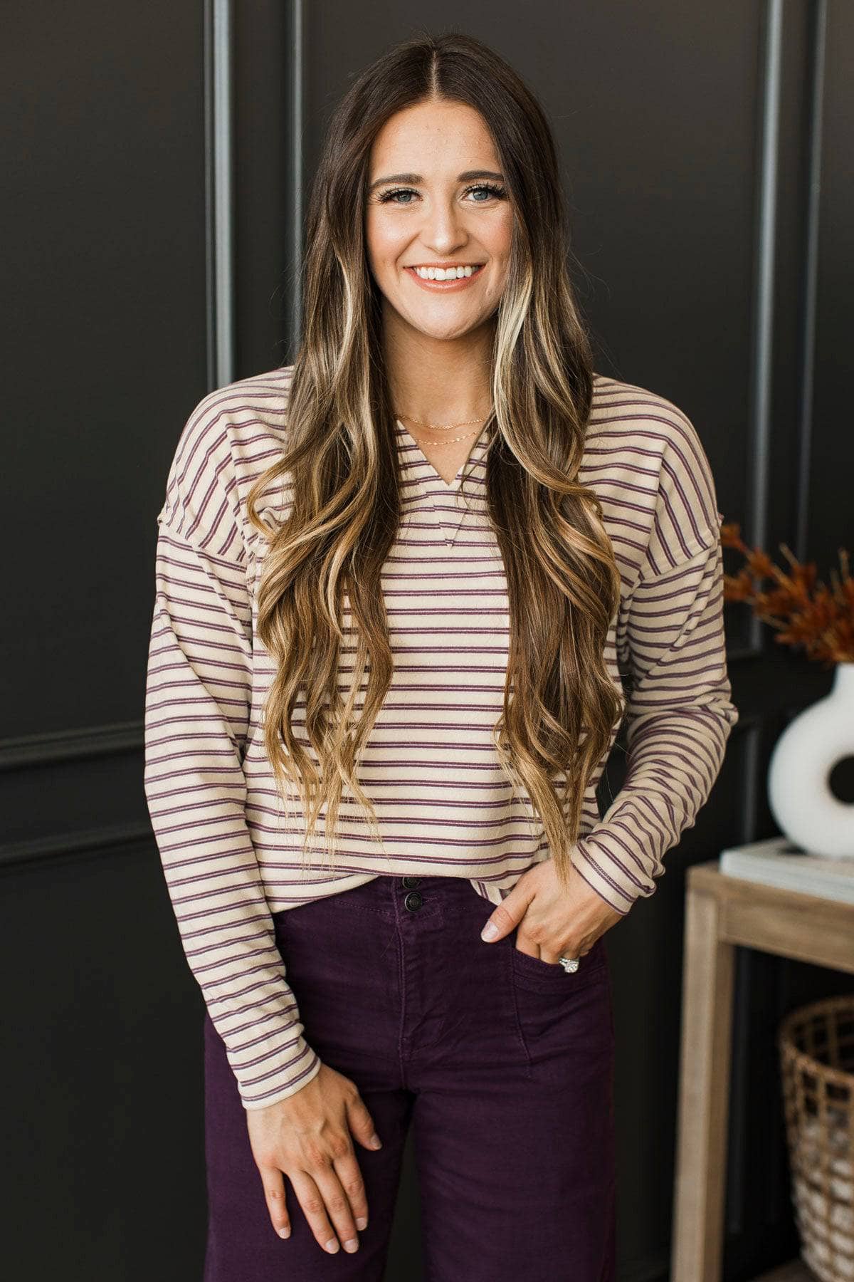 With Much Love Striped V-Neck Top- Ivory & Plum