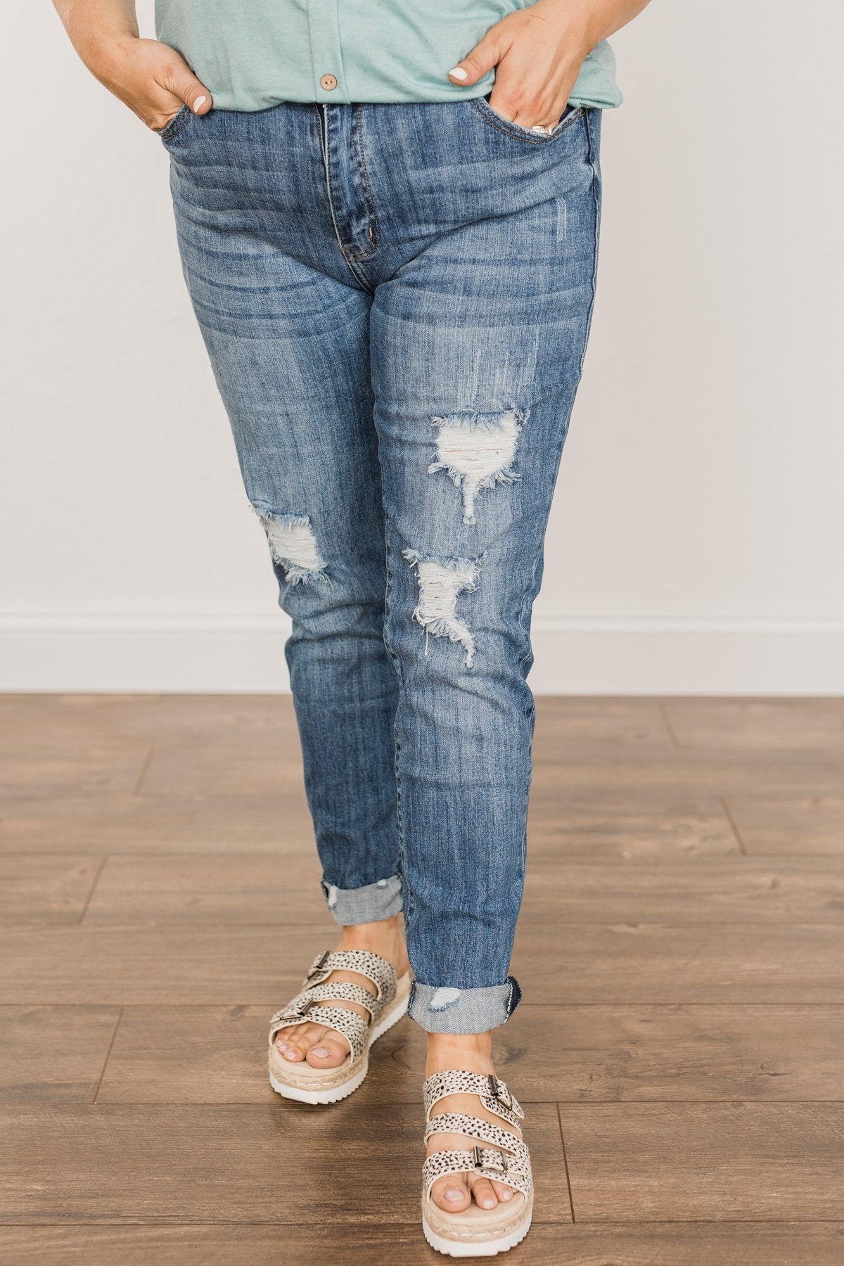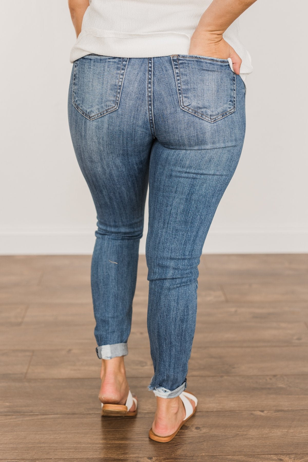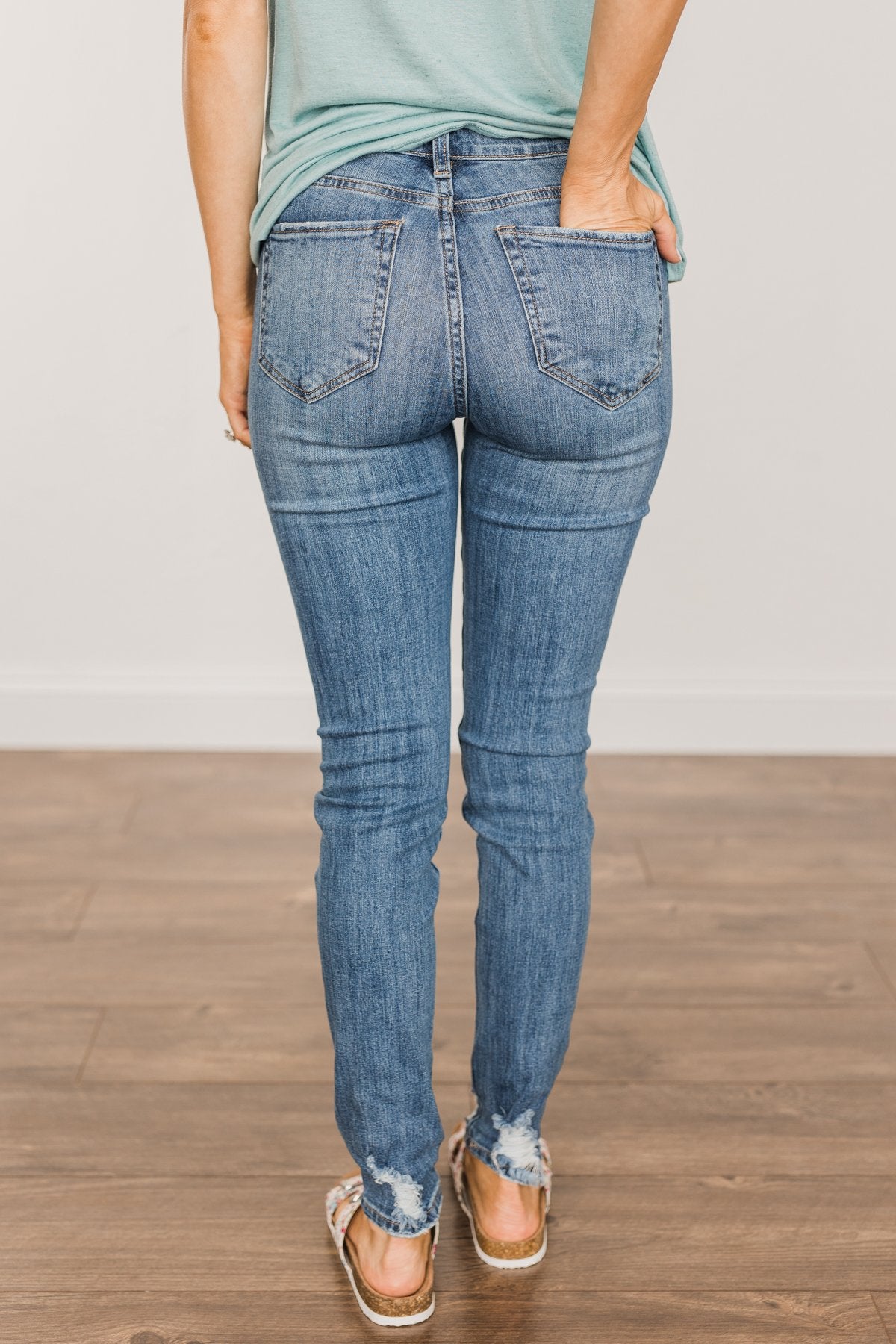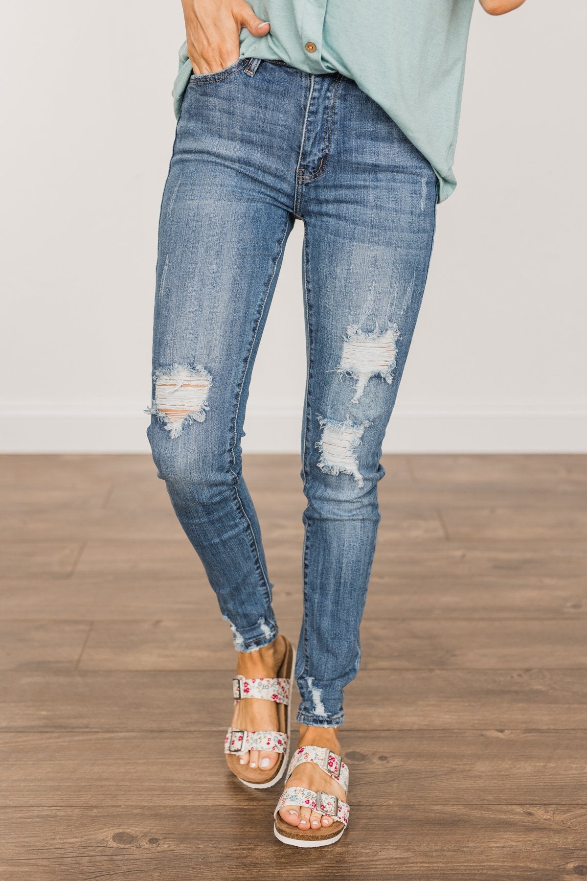 Grab these high-rise jeans for an effortless everyday ensemble! These are the perfect pair of denim for year-round styles with details like the five functional pockets, medium distressed wash, and a high-rise fit!