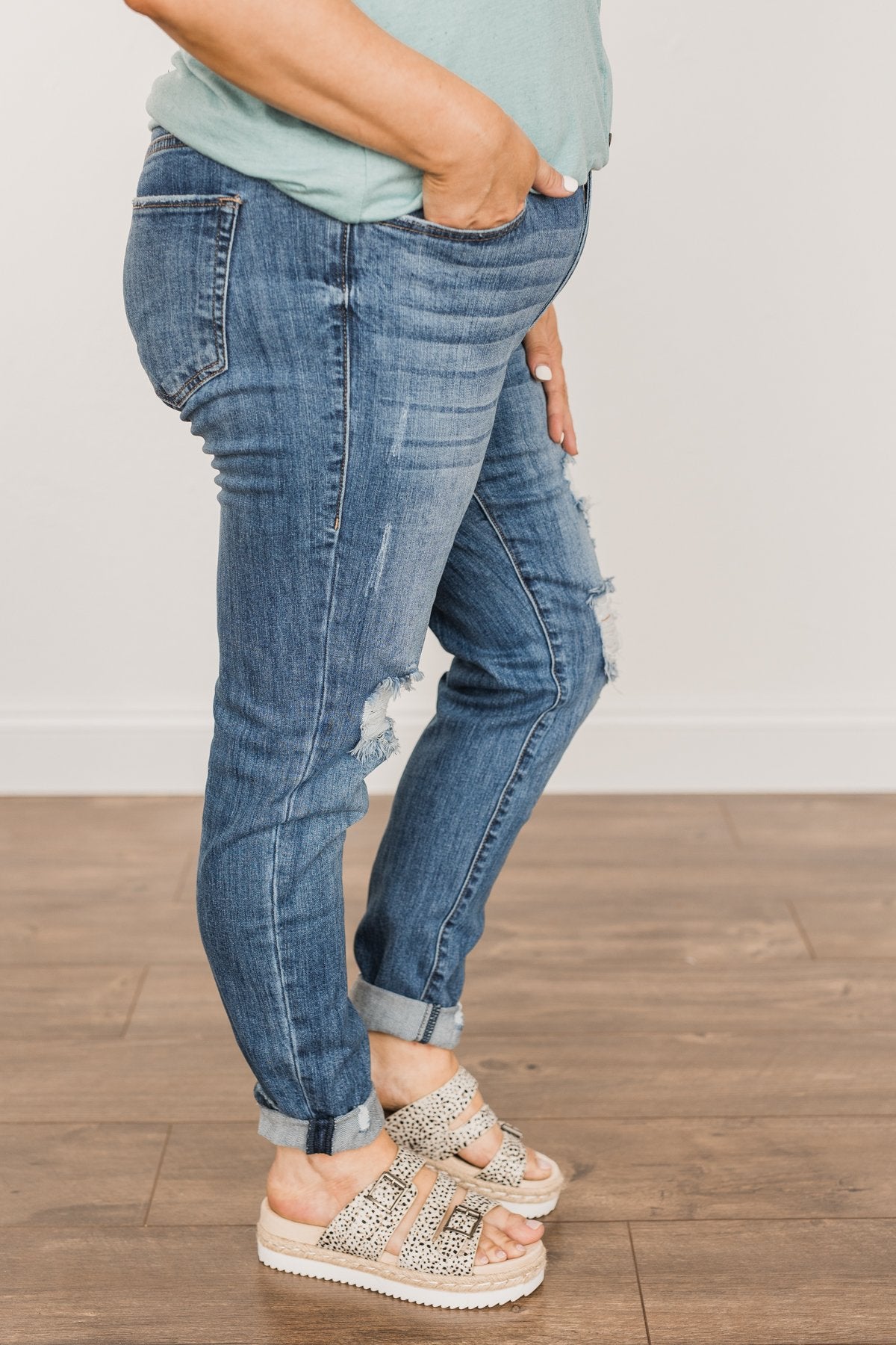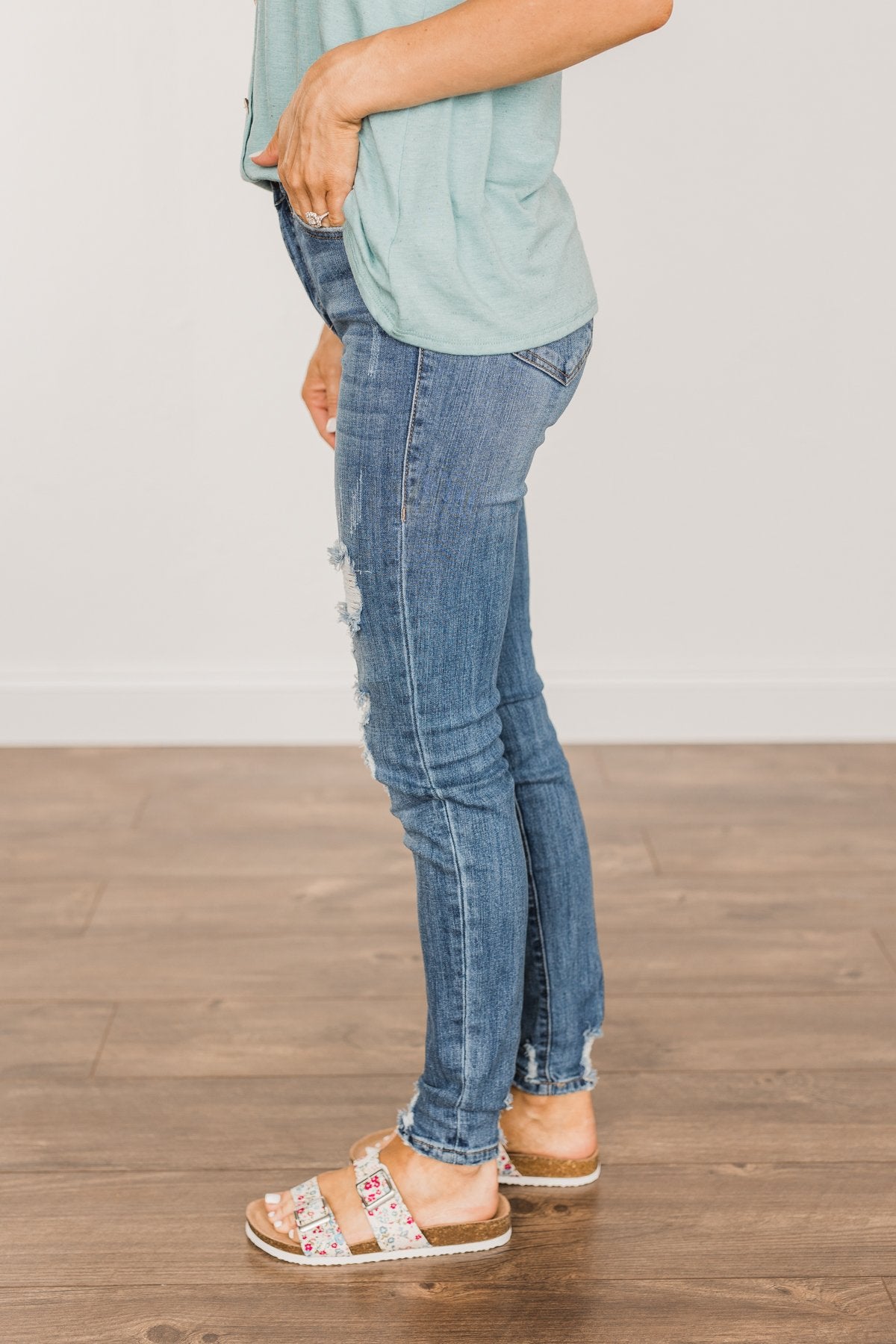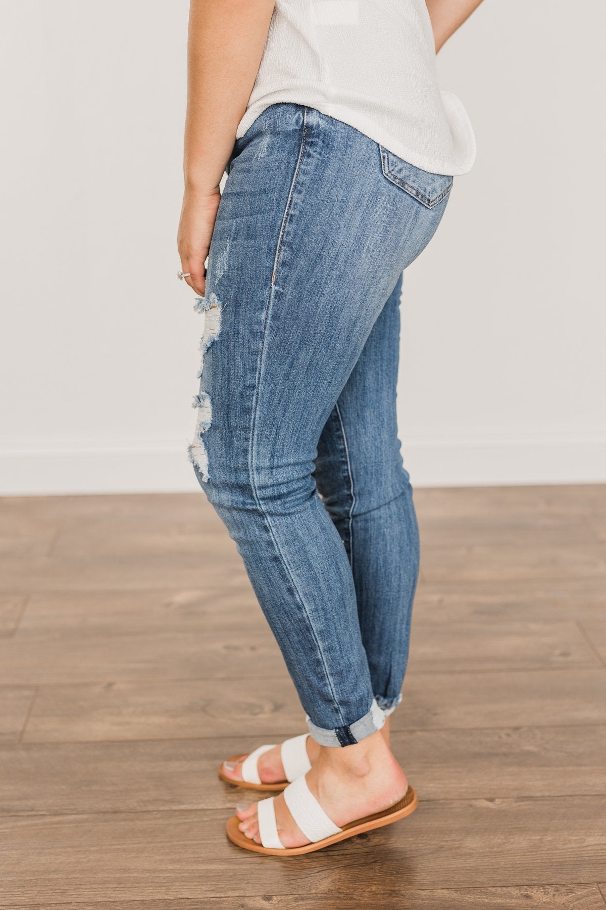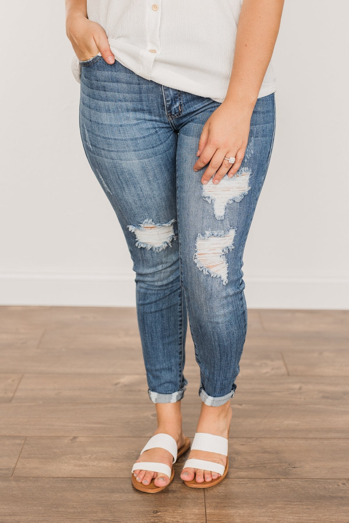 Grab these high-rise jeans for an effortless everyday ensemble! These are the perfect pair of denim for year-round styles with details like the five functional pockets, medium distressed wash, and a high-rise fit!