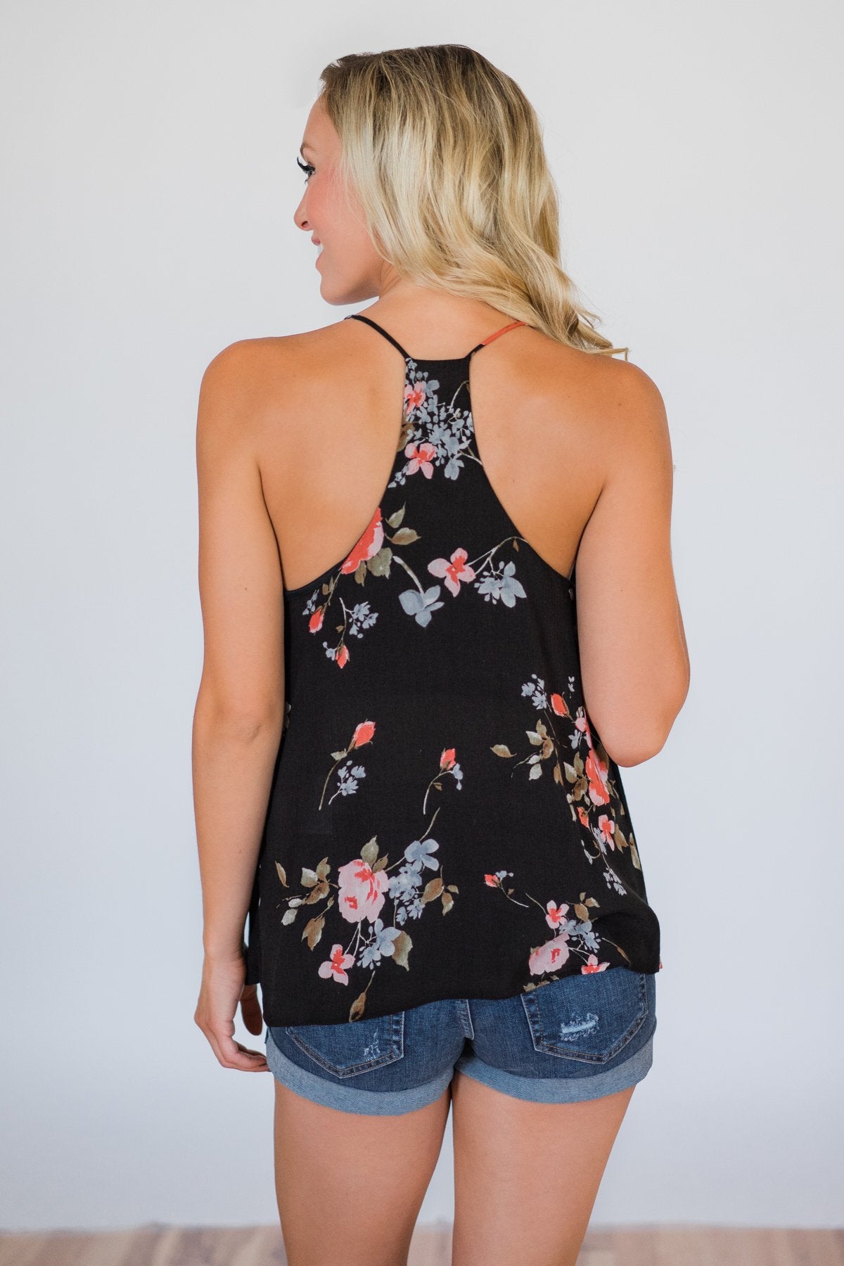 An adorable black floral racerback with partial lining. Perfect top for a night out!