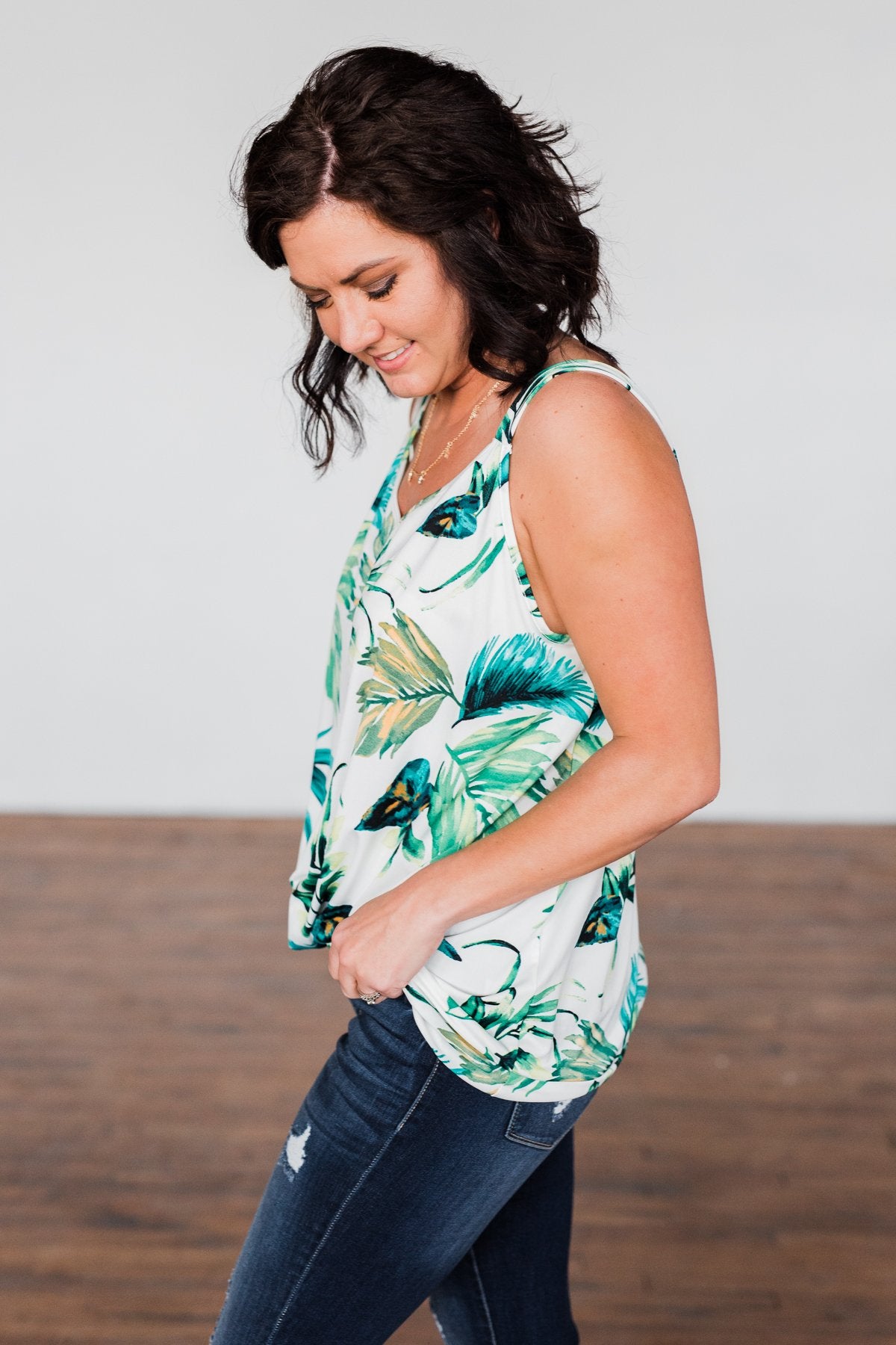 Bra-friendly tropical tank top with a front twist on a super soft material. This palm tree printed tank top is sure to keep you feeling like you're soaking up the sun all day no matter where you are! The built in front twist detail makes this tank flattering on all body types.