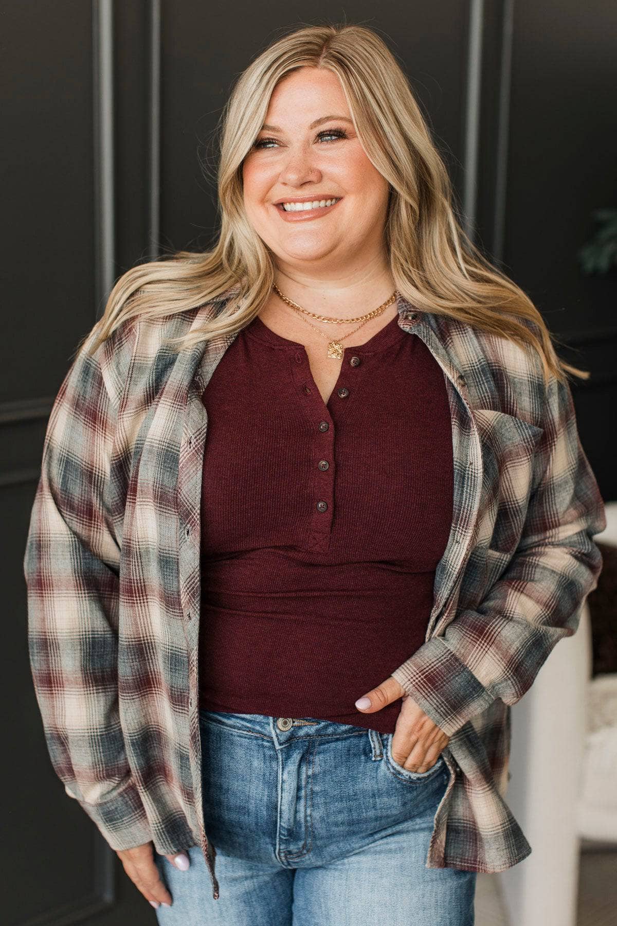 Wonderful shade of burgundy. I do like Henley tops I find them flattering . Can dress this with a cute flannel and boots . Fall vibes for sure !