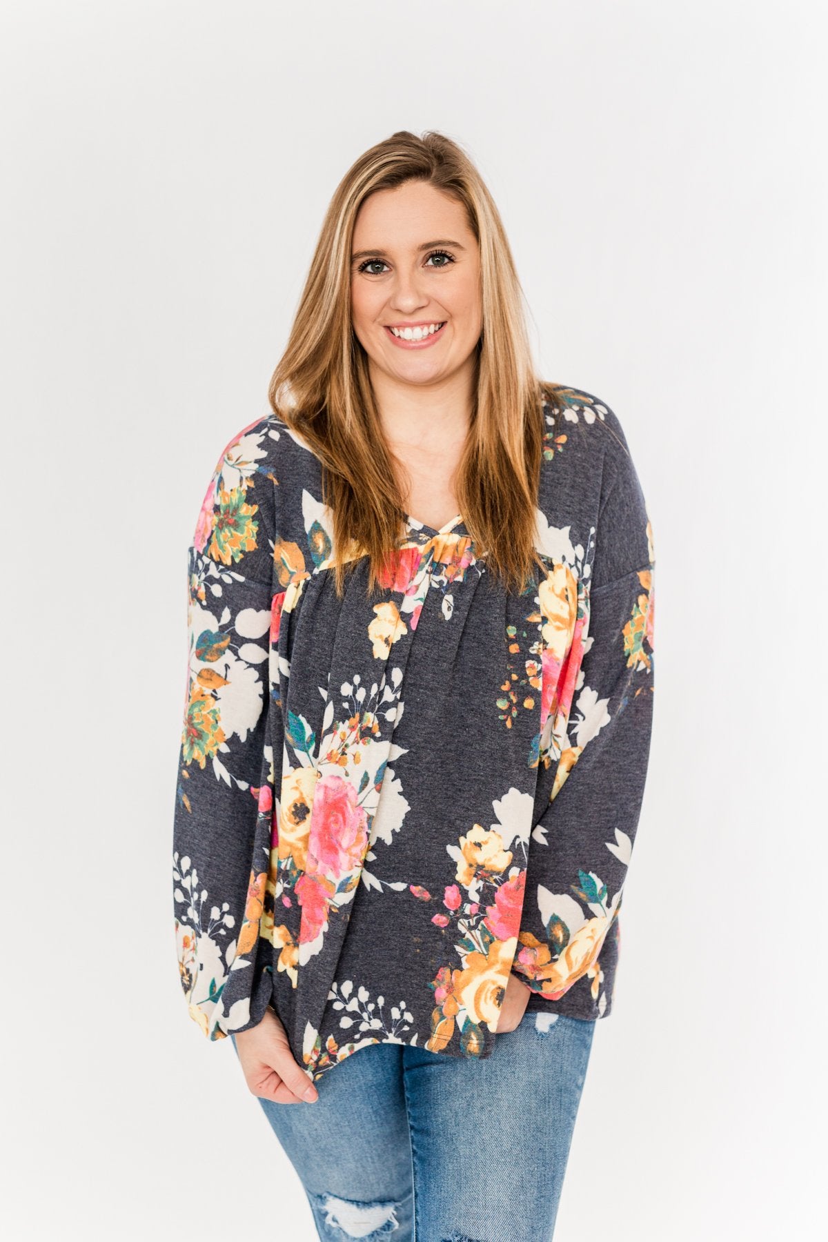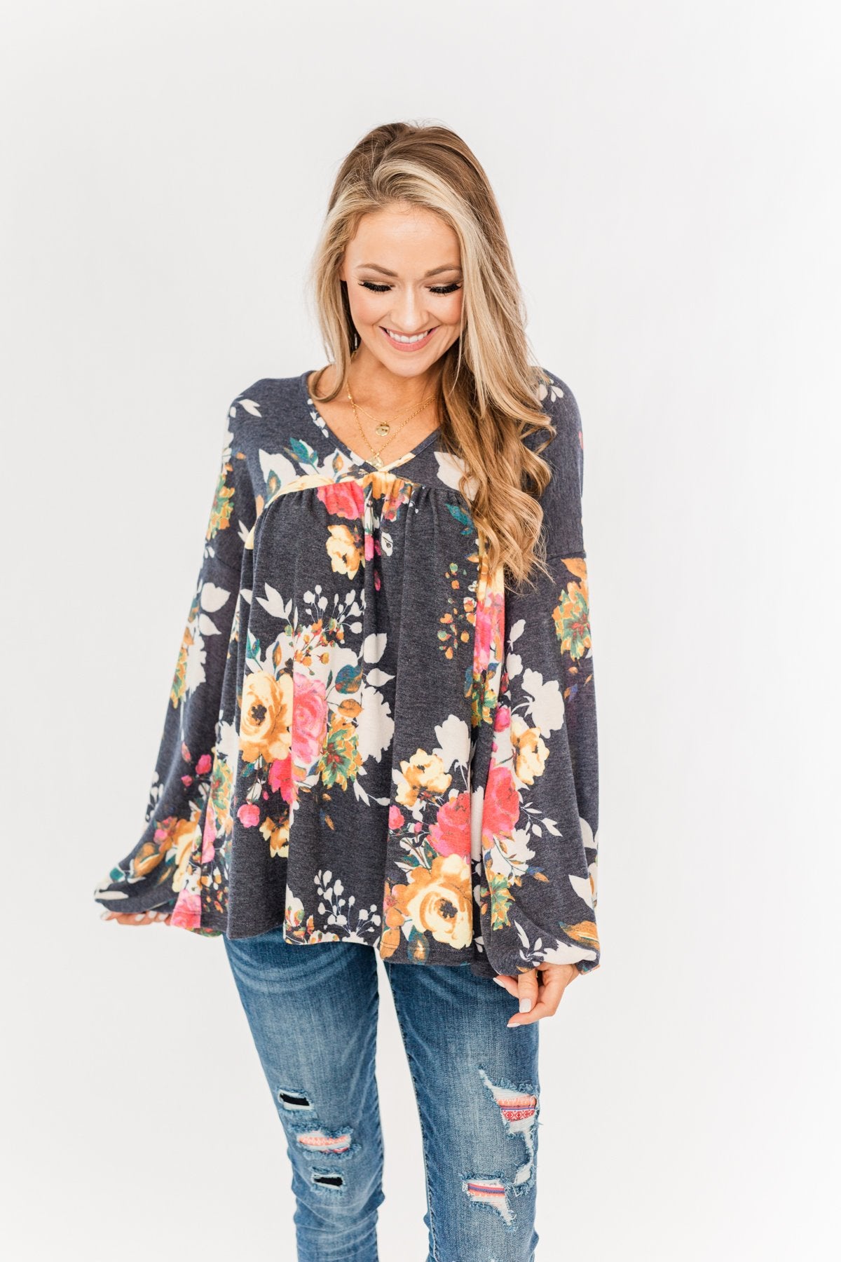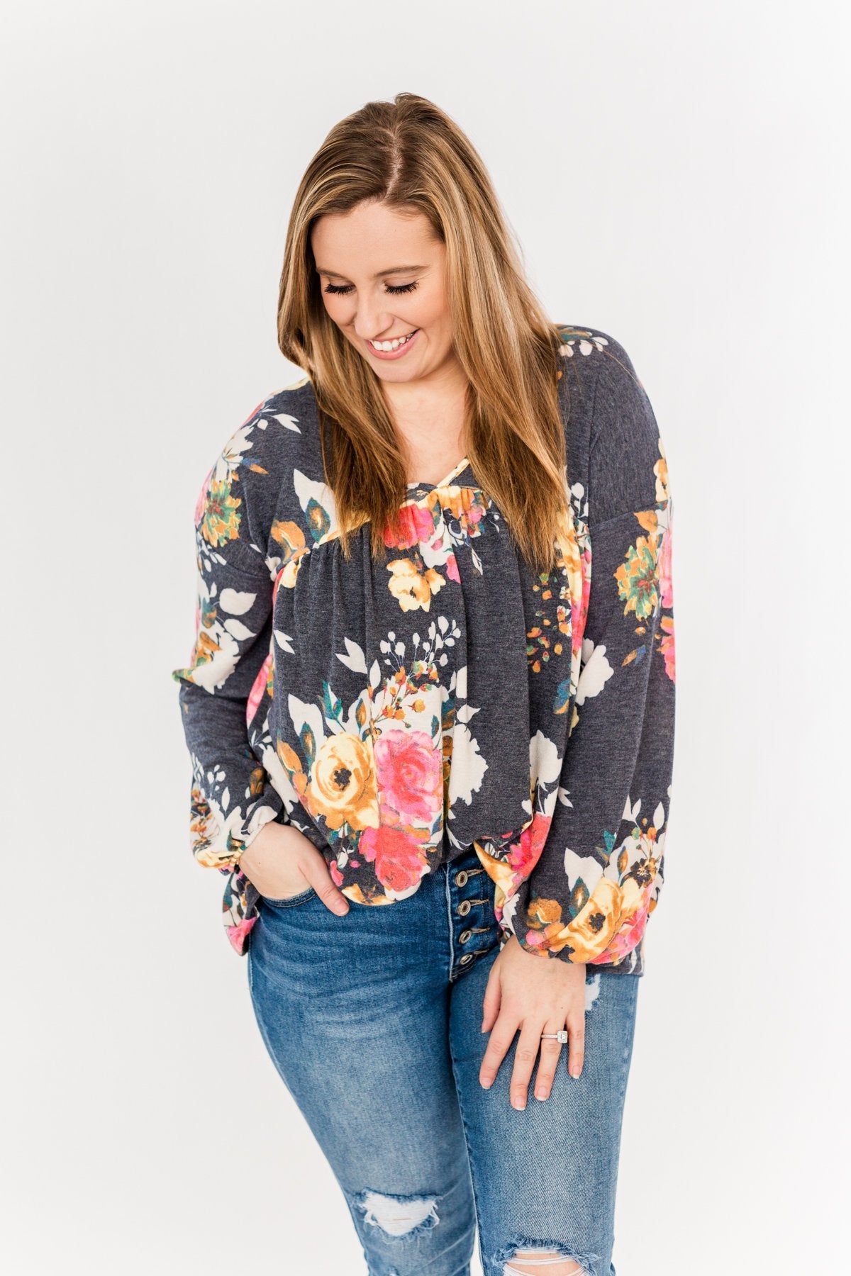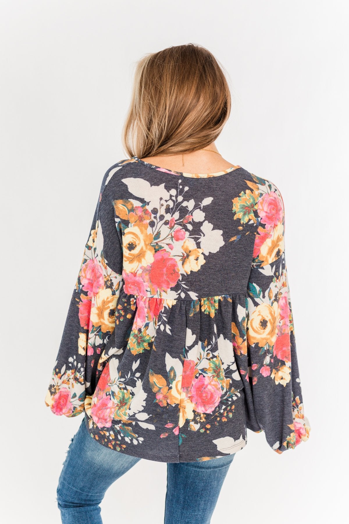 Jump into the new year with this floral print, long sleeve top! Featuring a gathered baby doll bust line, and balloon sleeves with elastic cuffs, you'll be able to stay comfortable in style! The navy background against the multicolored, floral pattern is the perfect way to add some color to your day during the colder weather. Rock this top and style it with your favorite pair of black jeans and booties for a super cute look to bring in the new year!