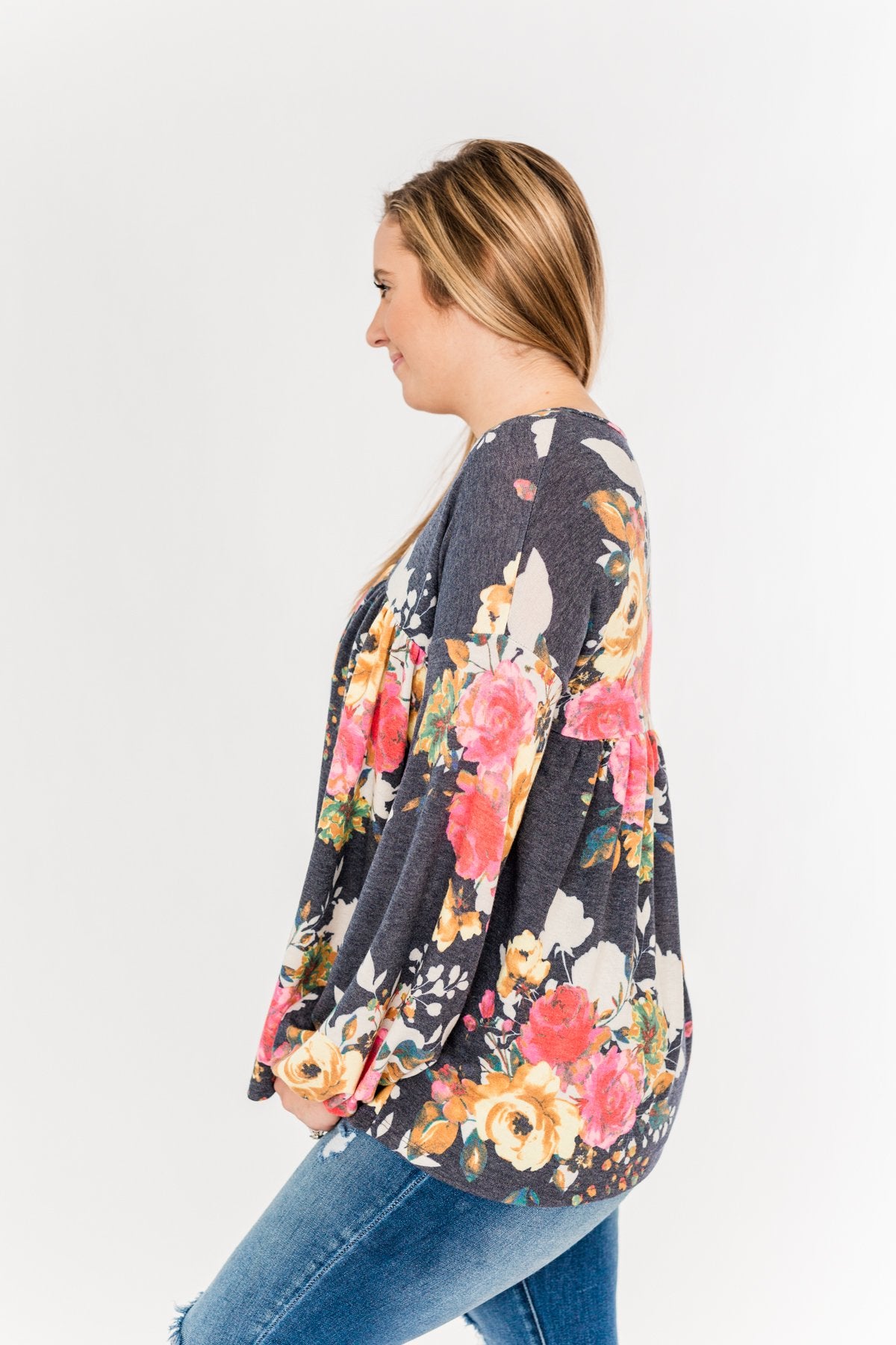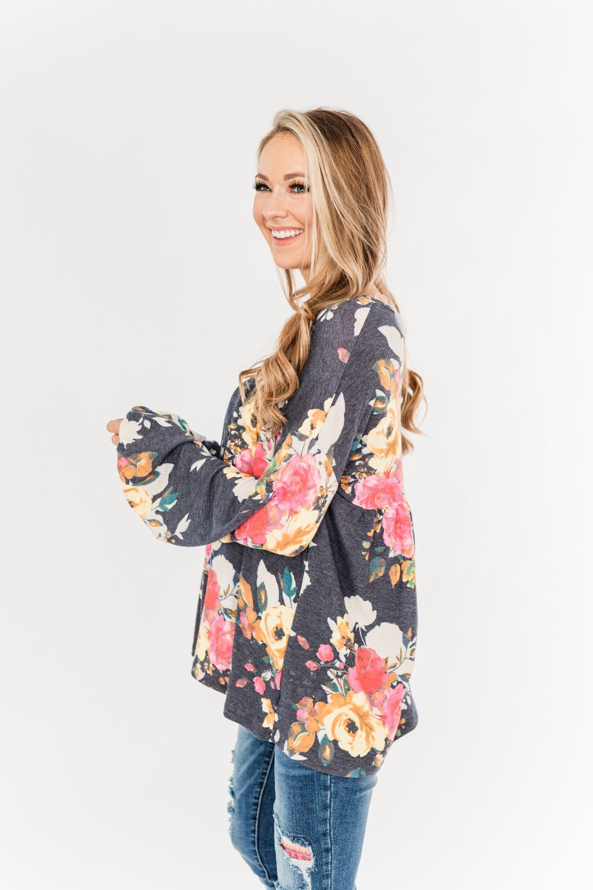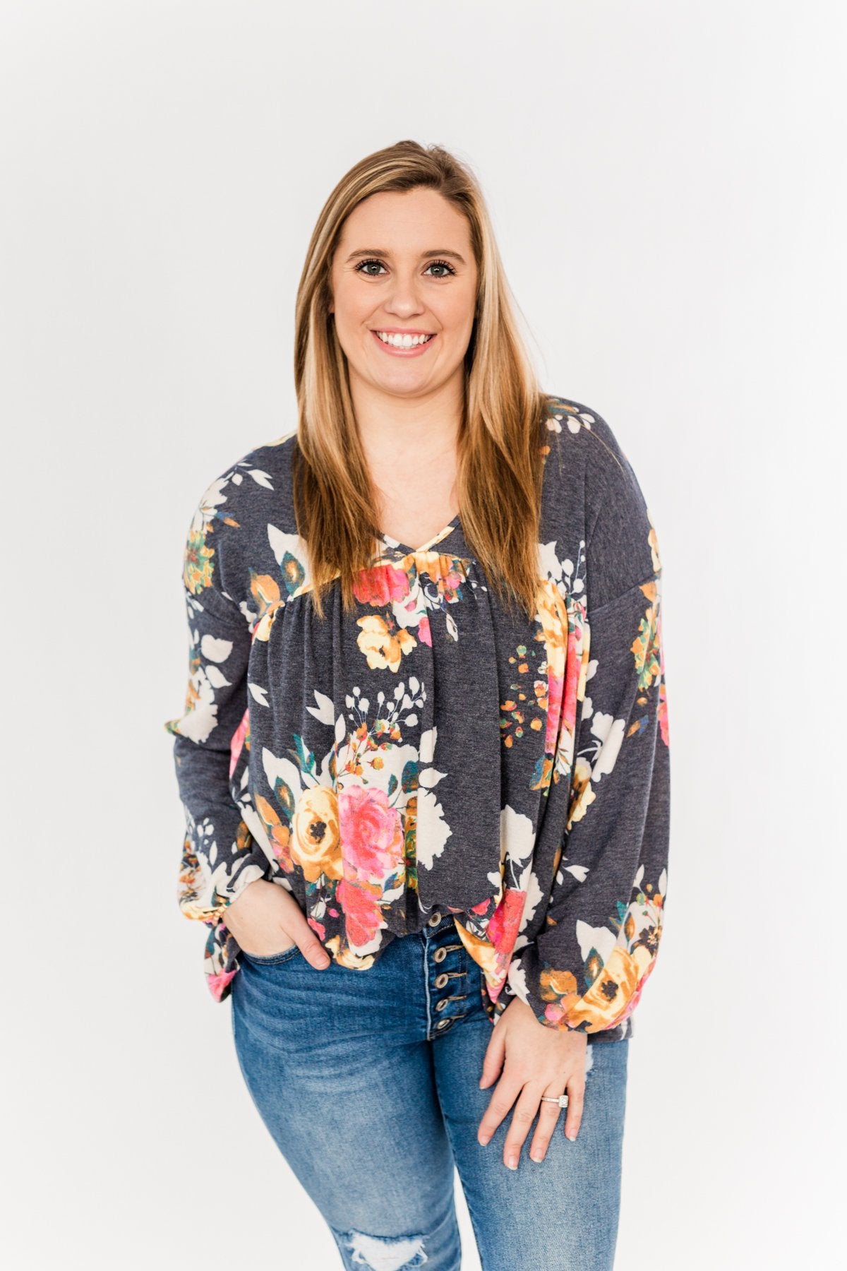 Jump into the new year with this floral print, long sleeve top! Featuring a gathered baby doll bust line, and balloon sleeves with elastic cuffs, you'll be able to stay comfortable in style! The navy background against the multicolored, floral pattern is the perfect way to add some color to your day during the colder weather. Rock this top and style it with your favorite pair of black jeans and booties for a super cute look to bring in the new year!