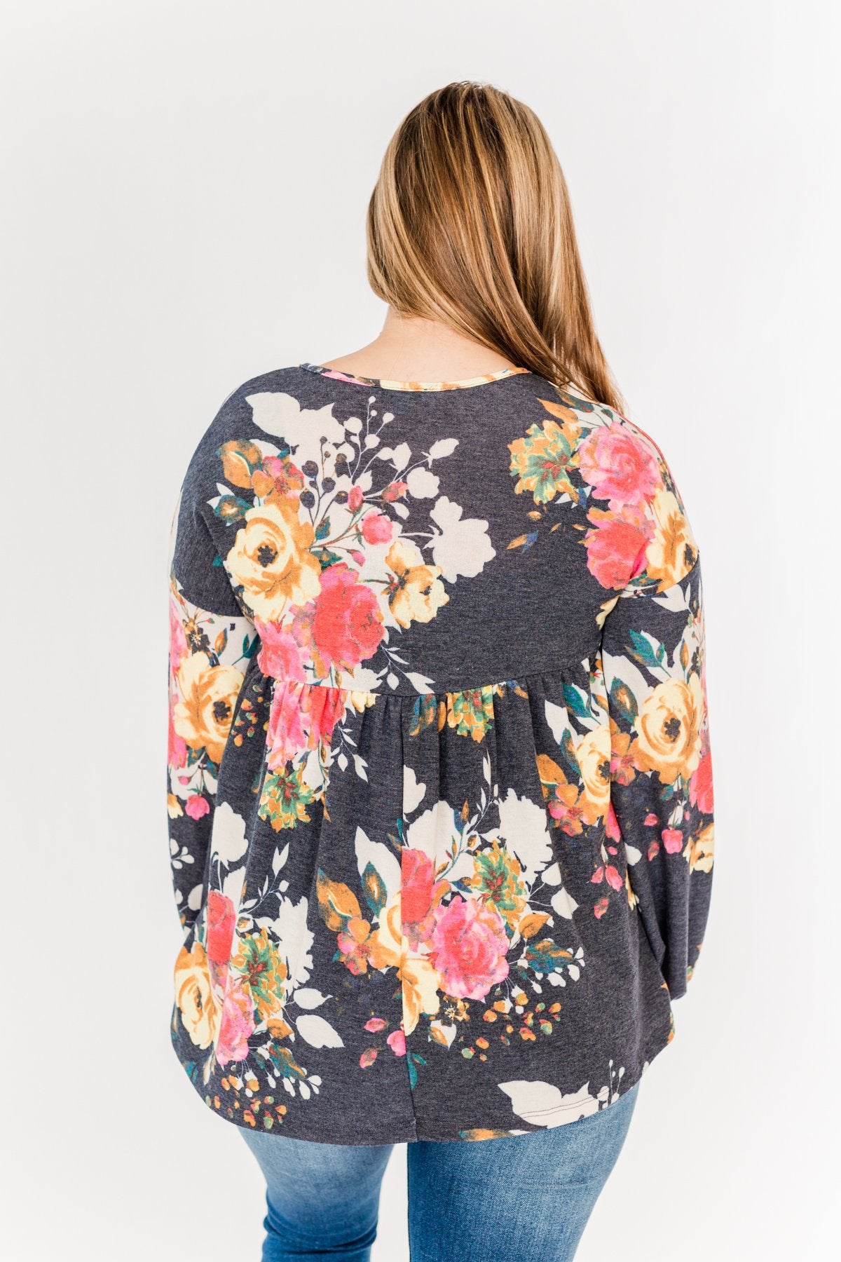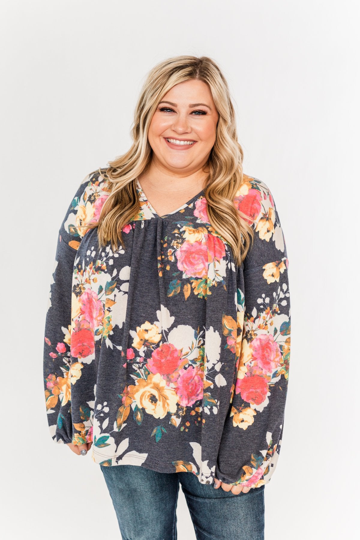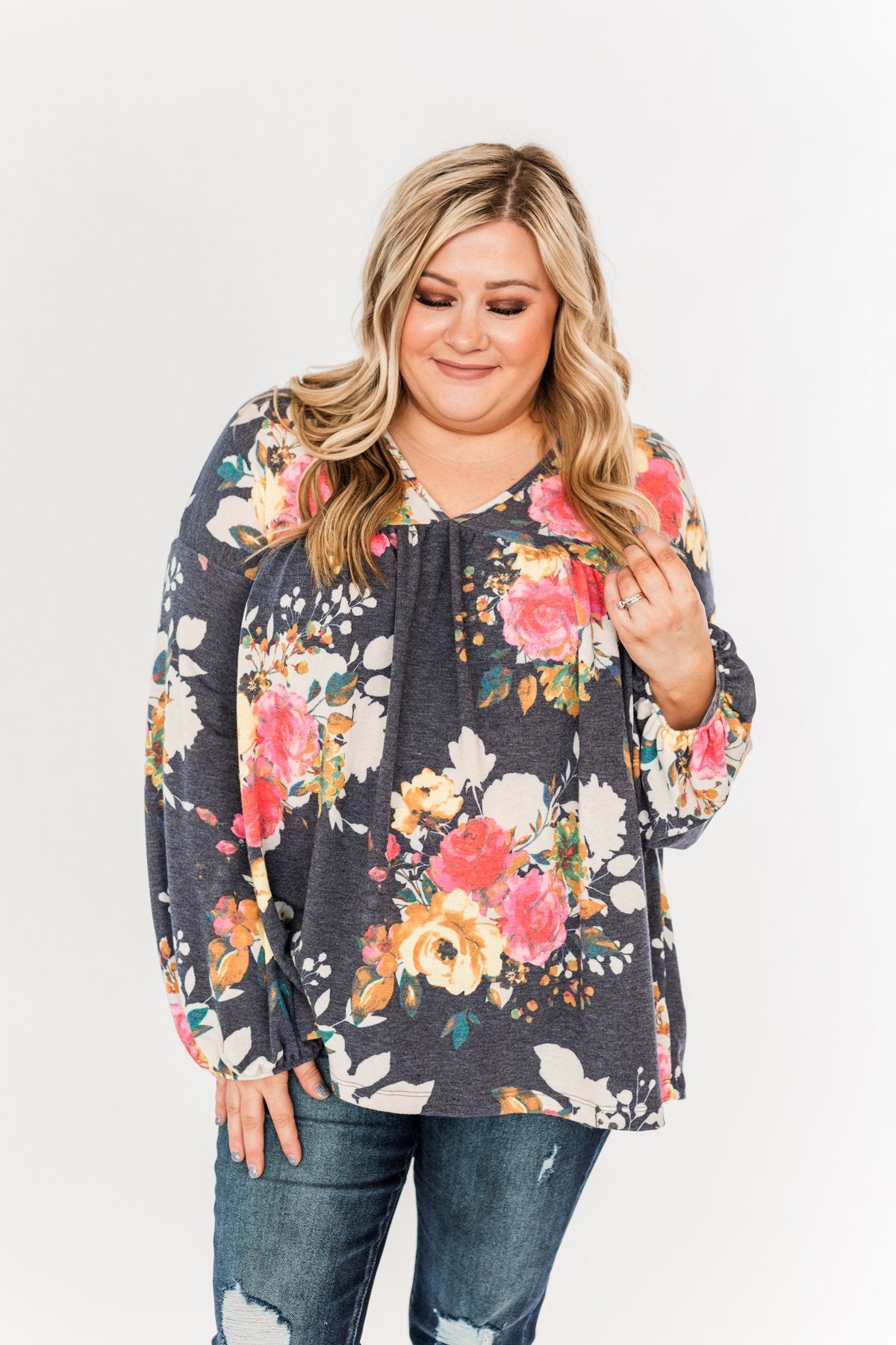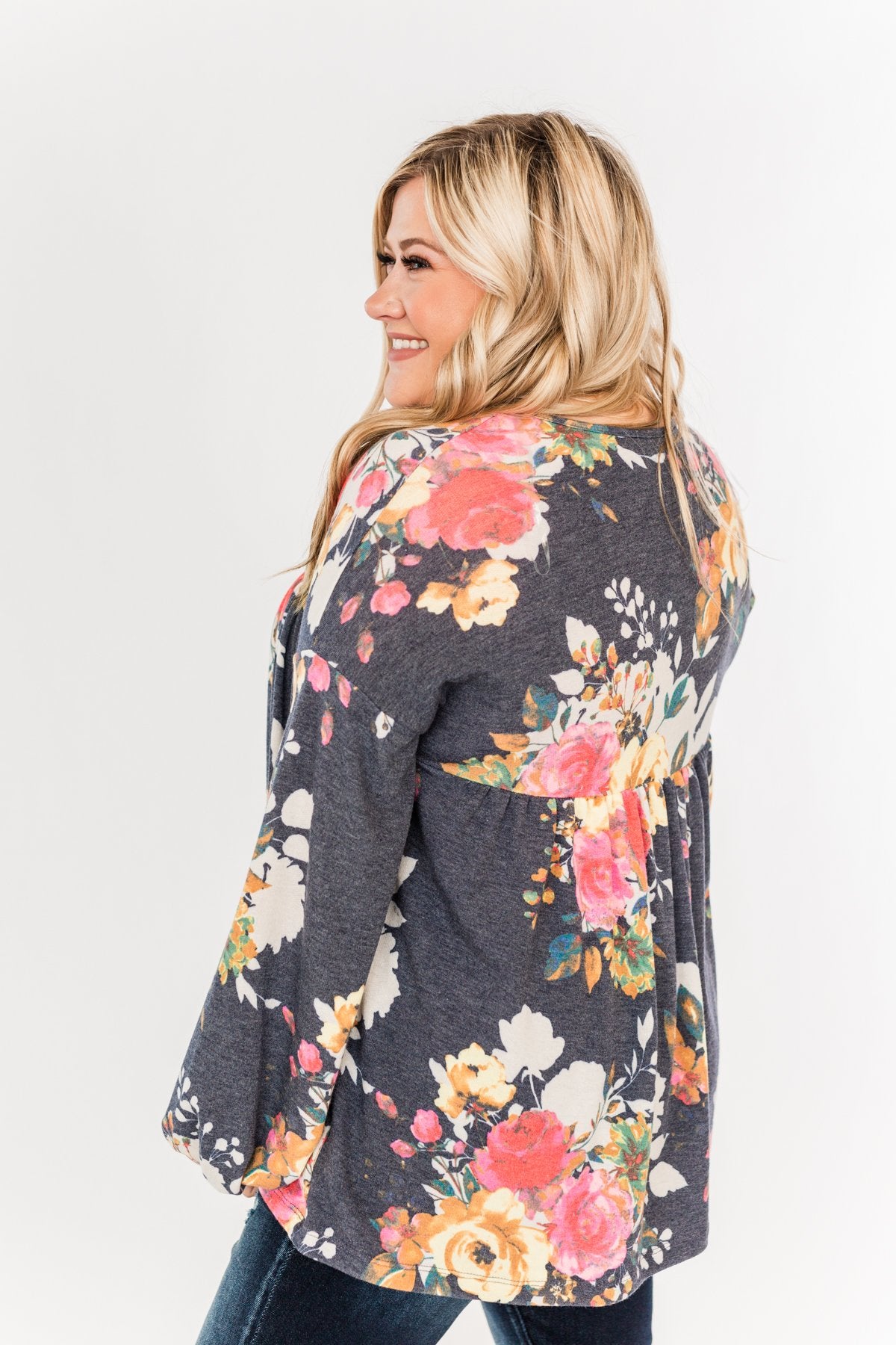 Jump into the new year with this floral print, long sleeve top! Featuring a gathered baby doll bust line, and balloon sleeves with elastic cuffs, you'll be able to stay comfortable in style! The navy background against the multicolored, floral pattern is the perfect way to add some color to your day during the colder weather. Rock this top and style it with your favorite pair of black jeans and booties for a super cute look to bring in the new year!