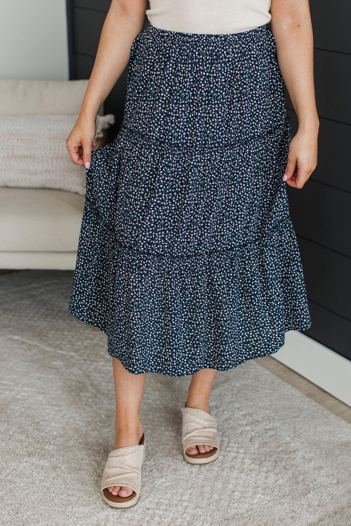 Showing Adoration Floral Skirt- Navy