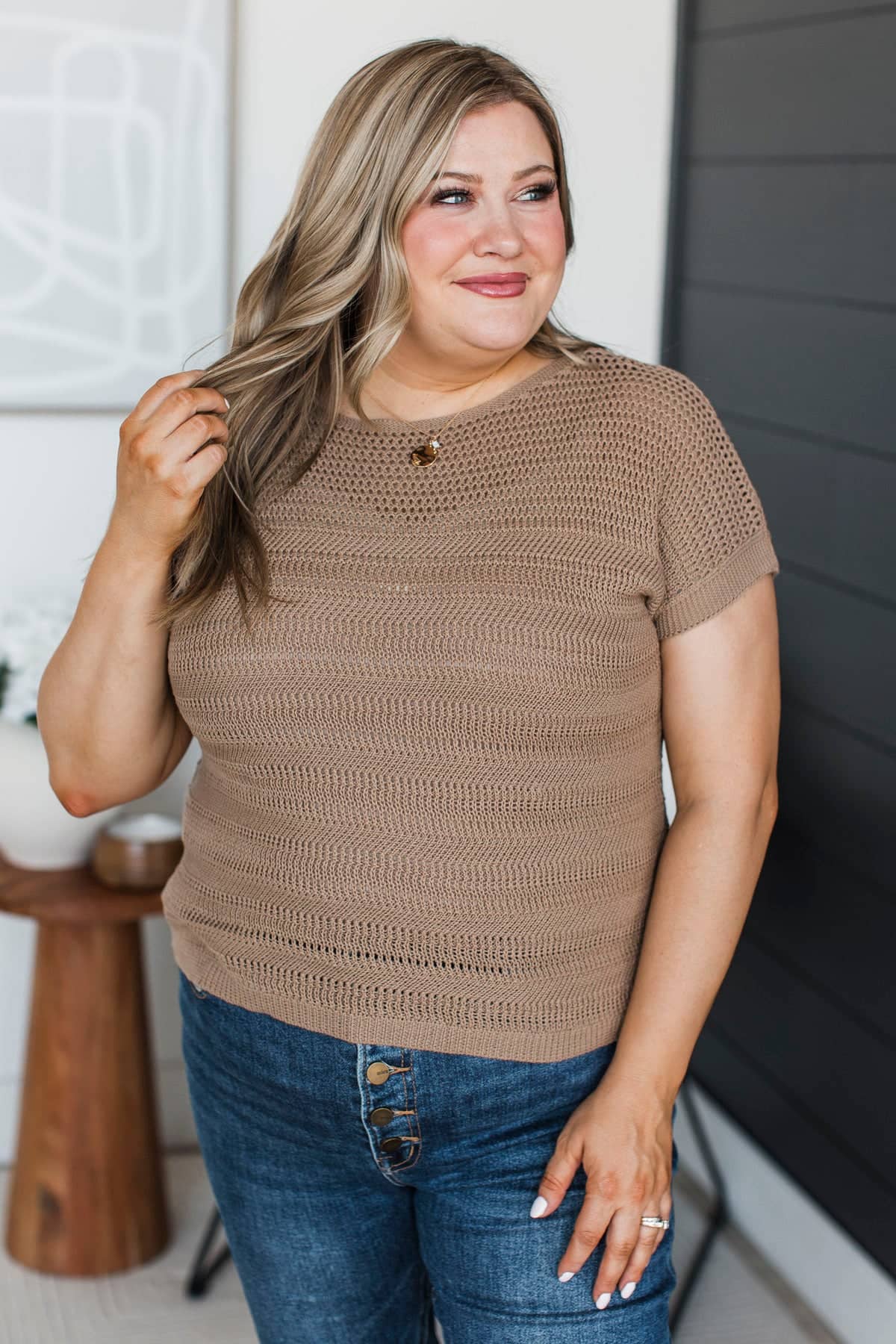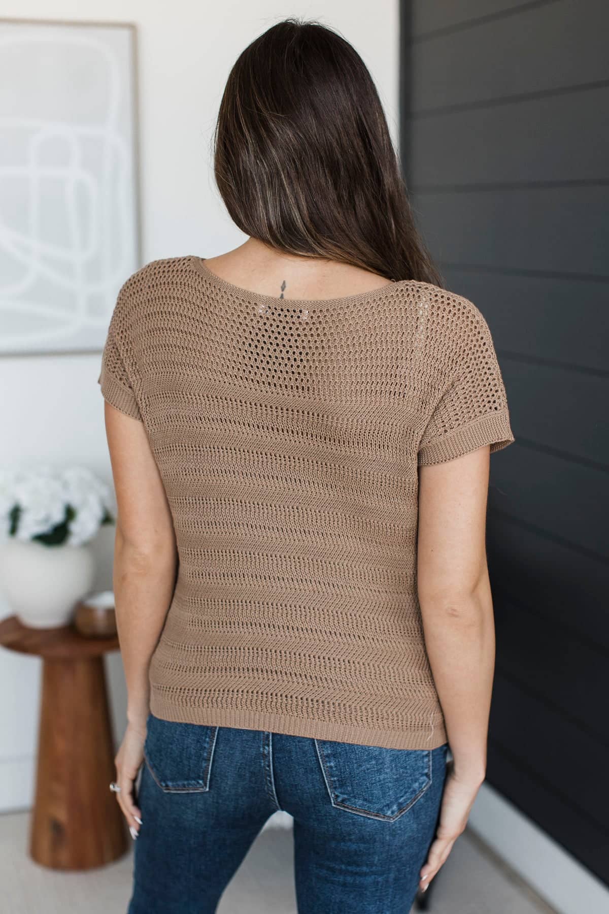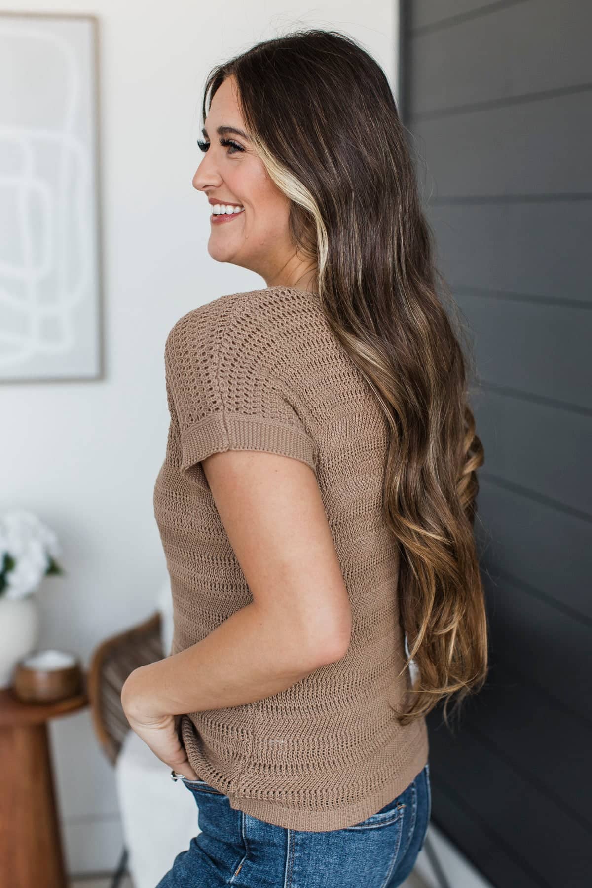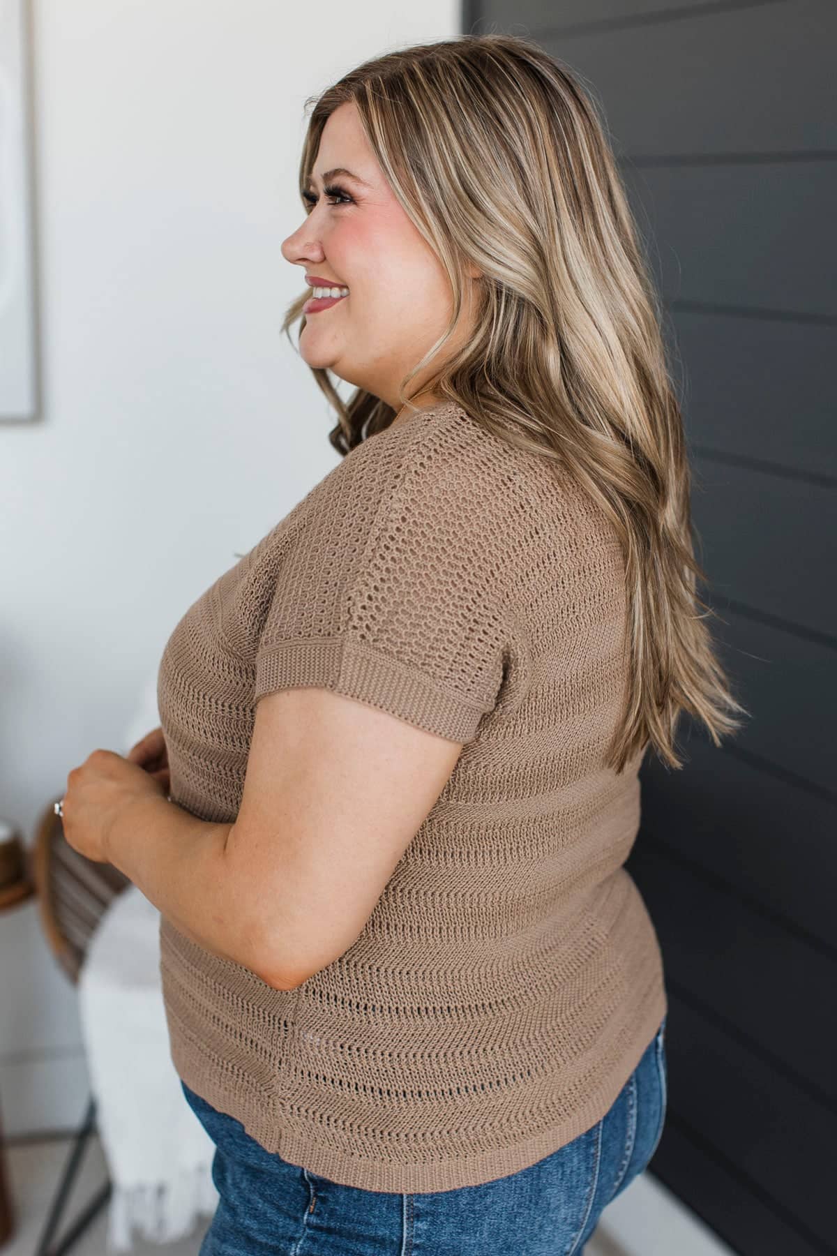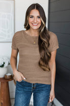 Stay Encouraged Short Sleeve Pointelle Sweater Top- Mocha