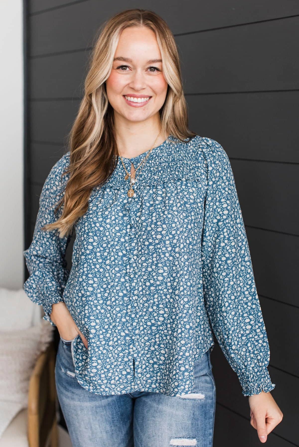 • Smocked square neckline