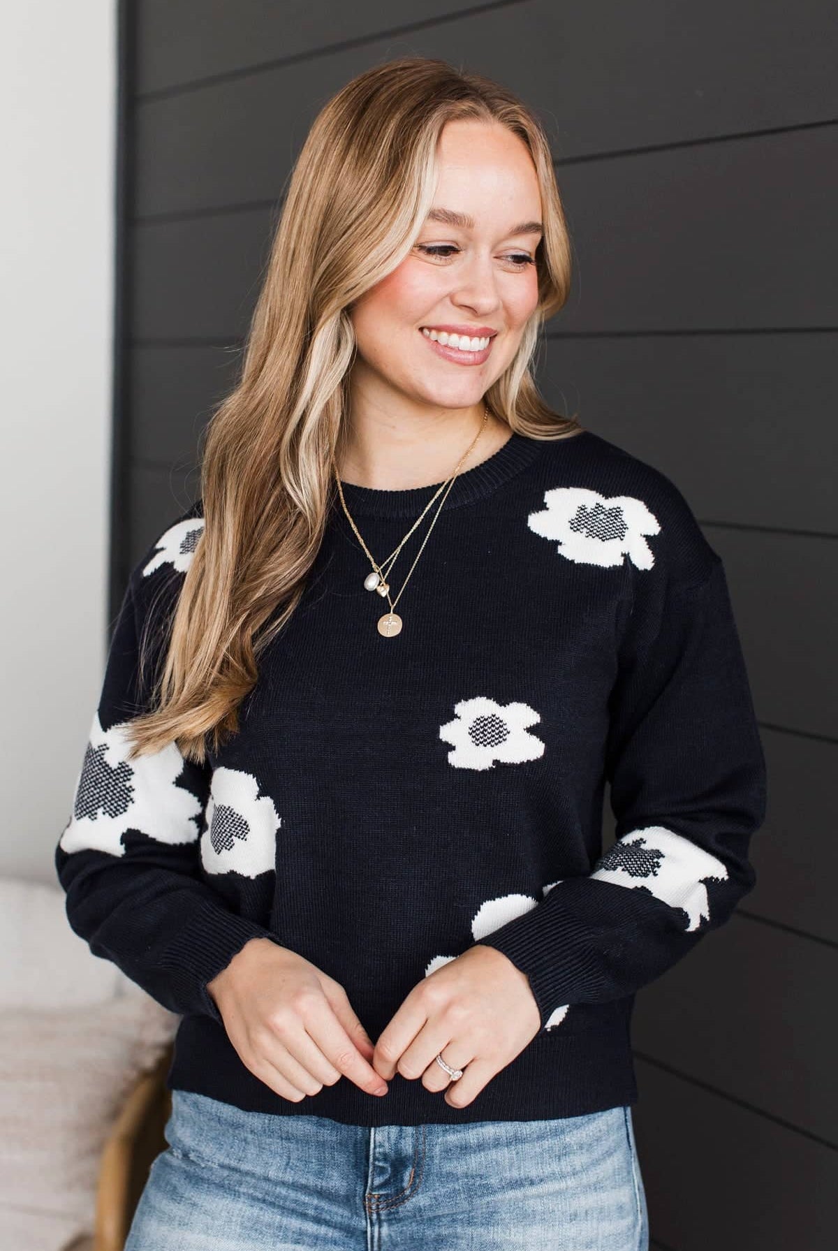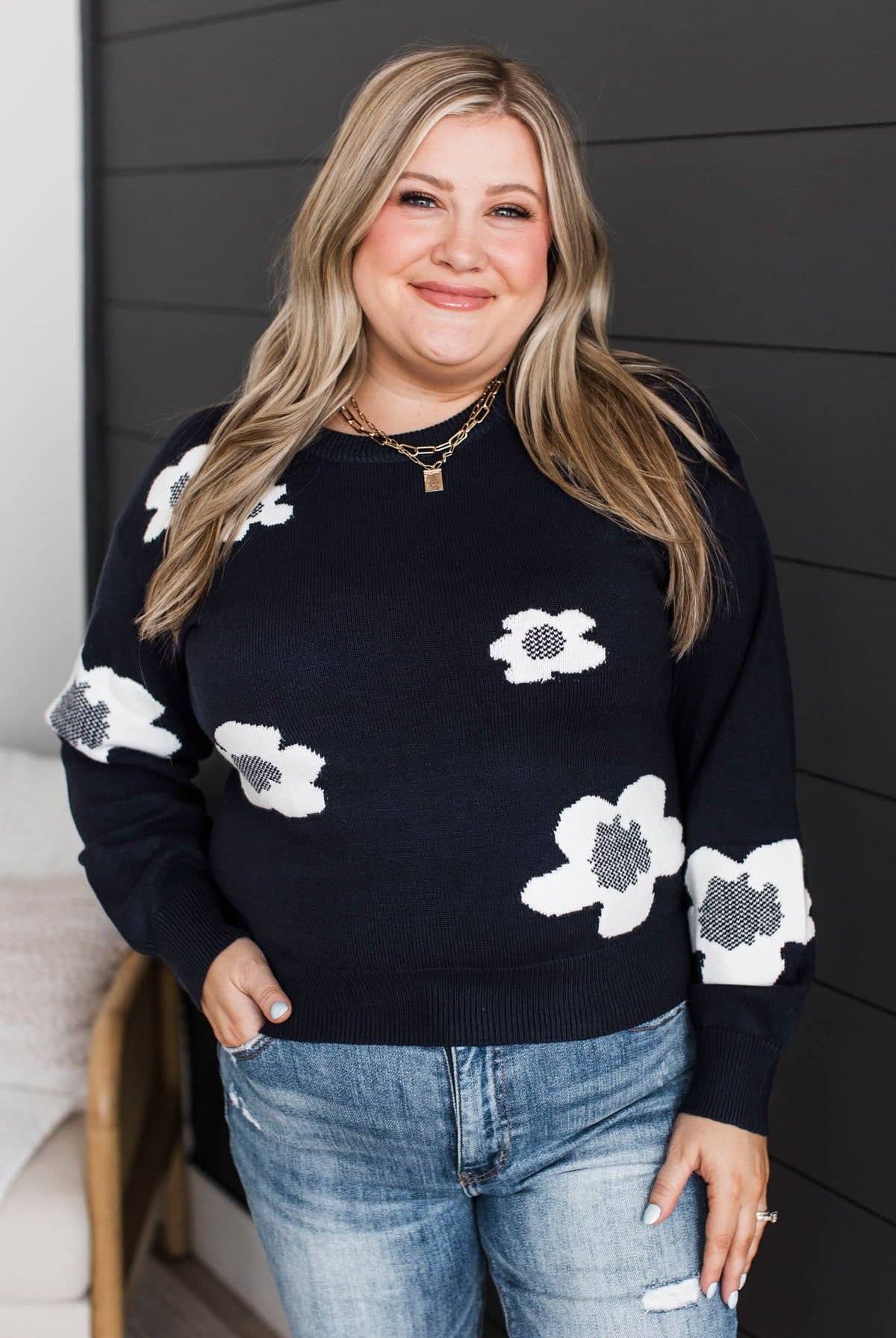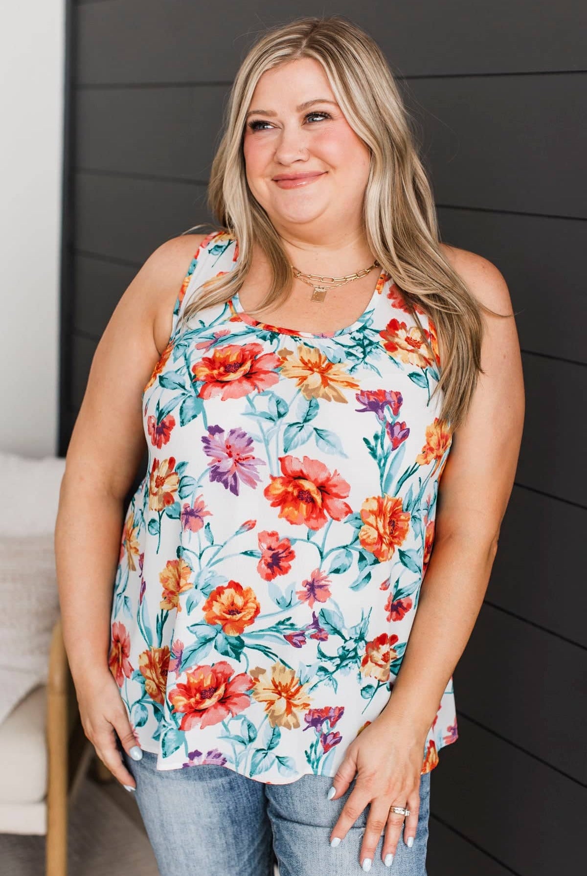 This adorable floral print tank top is great to pair with our new comfy cardigan! Style with your favorite jeans and booties for the cold weather.
