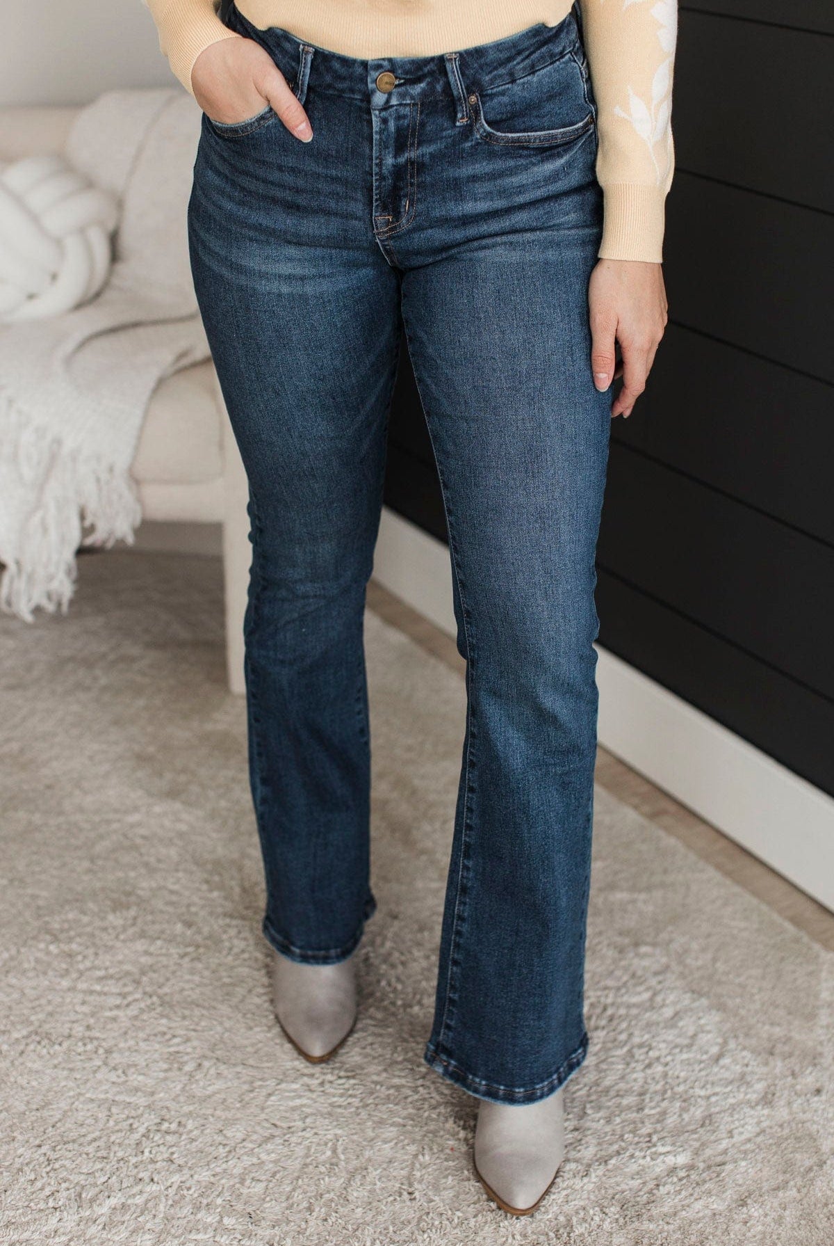 - Mid-rise straight leg jeans