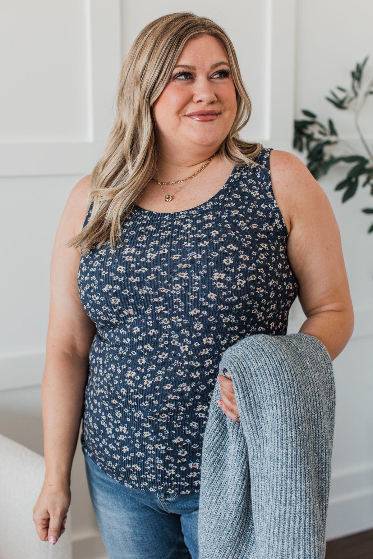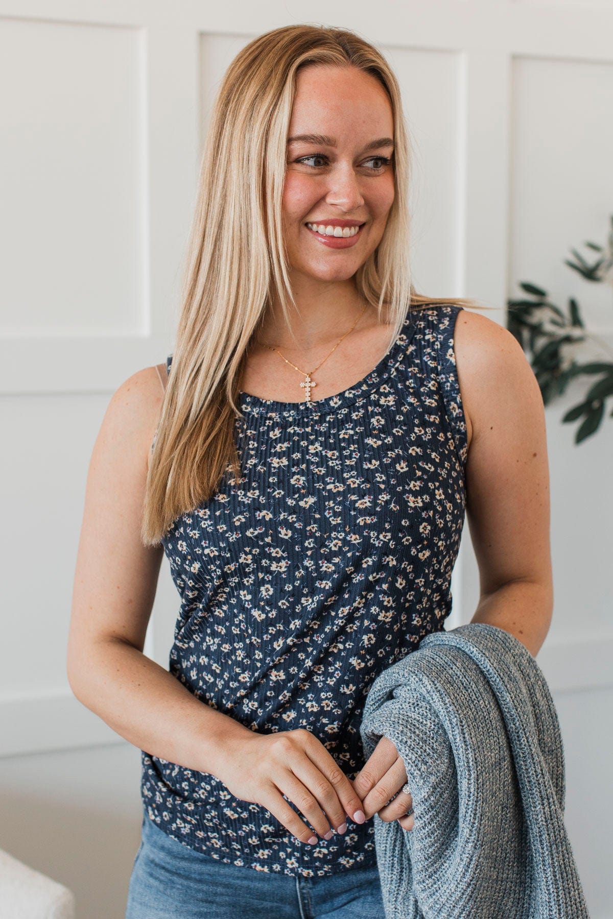Through Spring Floral Tank Top- Dark Denim Blue