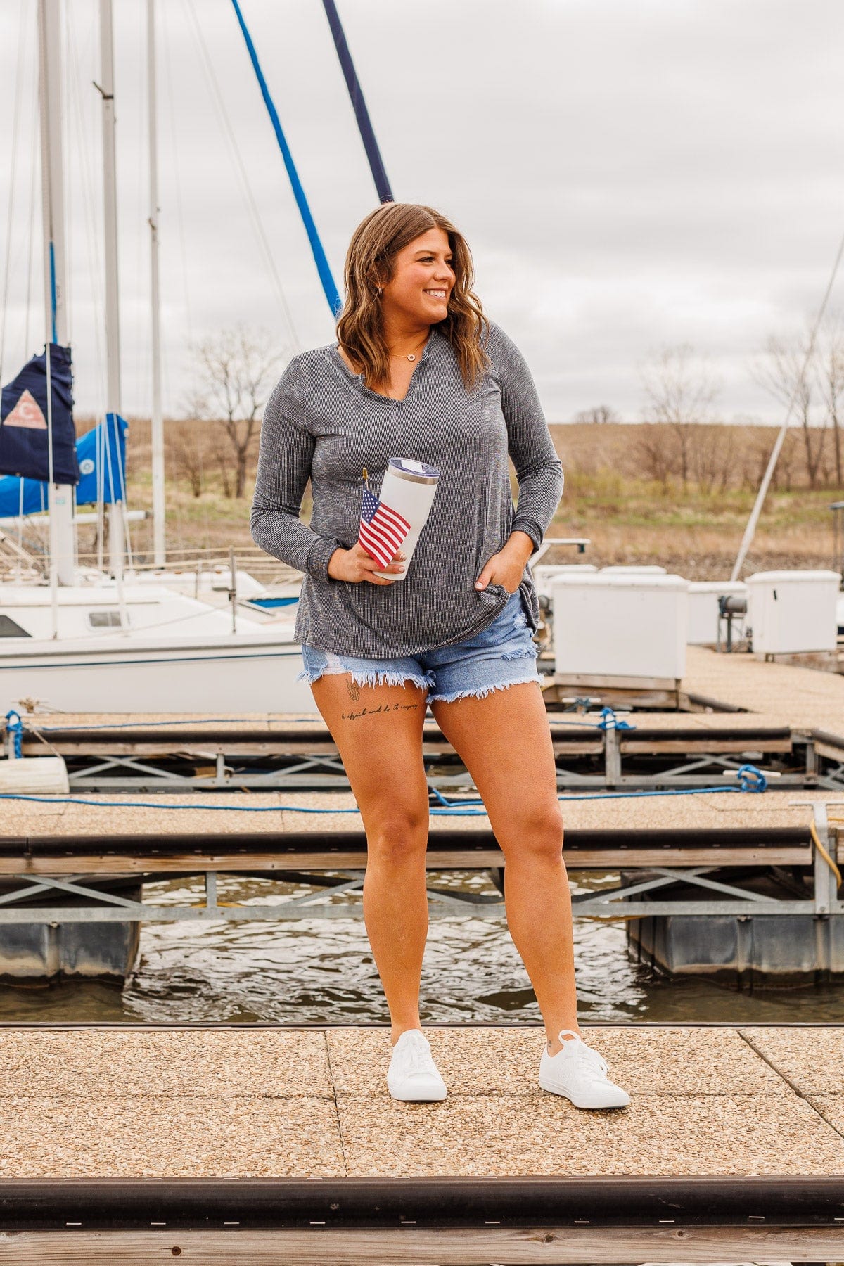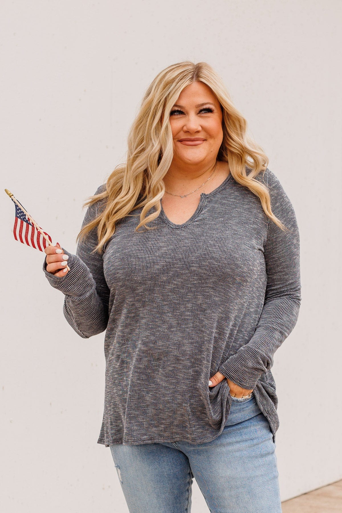 Keep your look casual with this everyday long sleeve top! You’ll add some simple style to your day with details like the dark shade of navy blue on a lightweight ribbed knit material with a notched neckline!