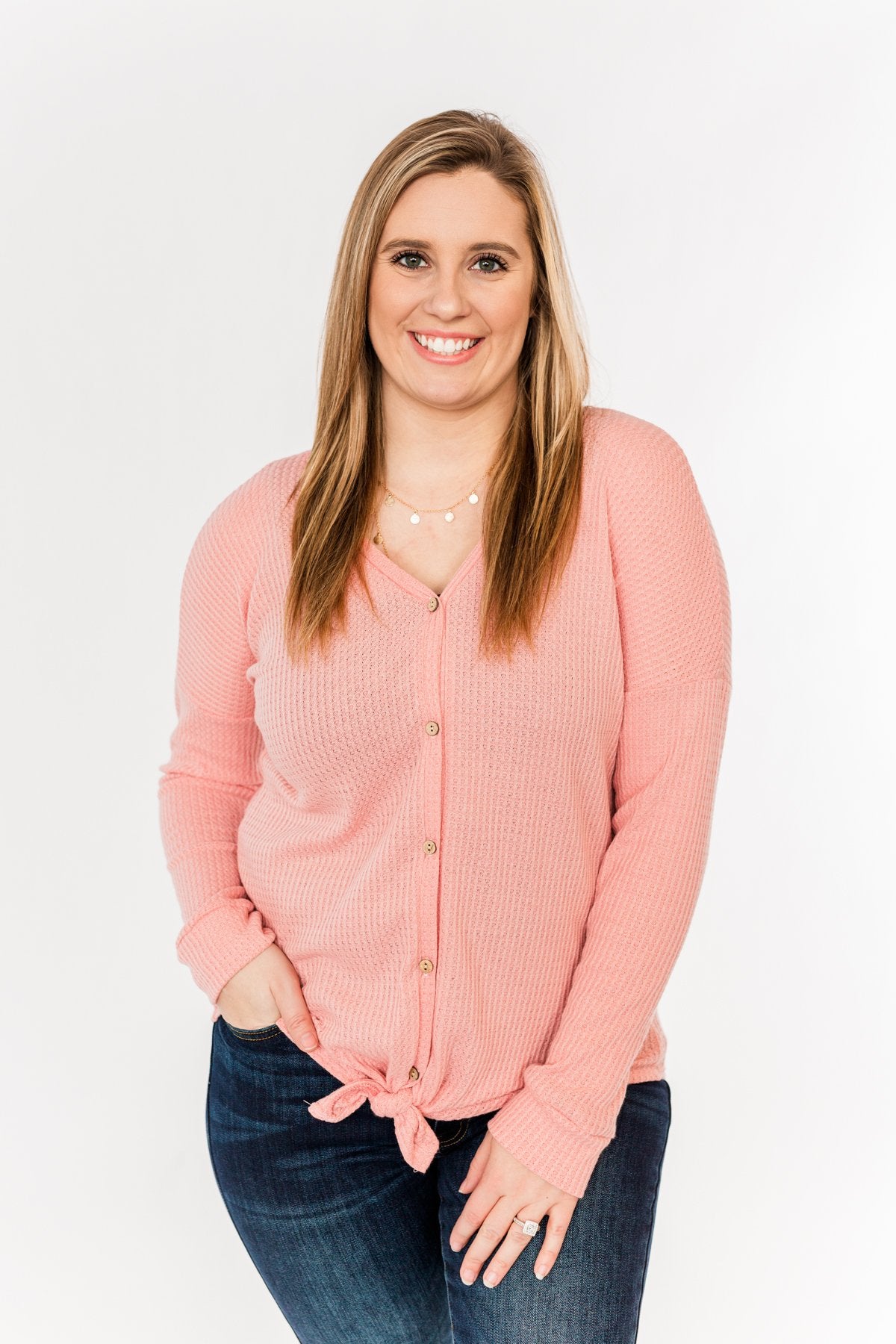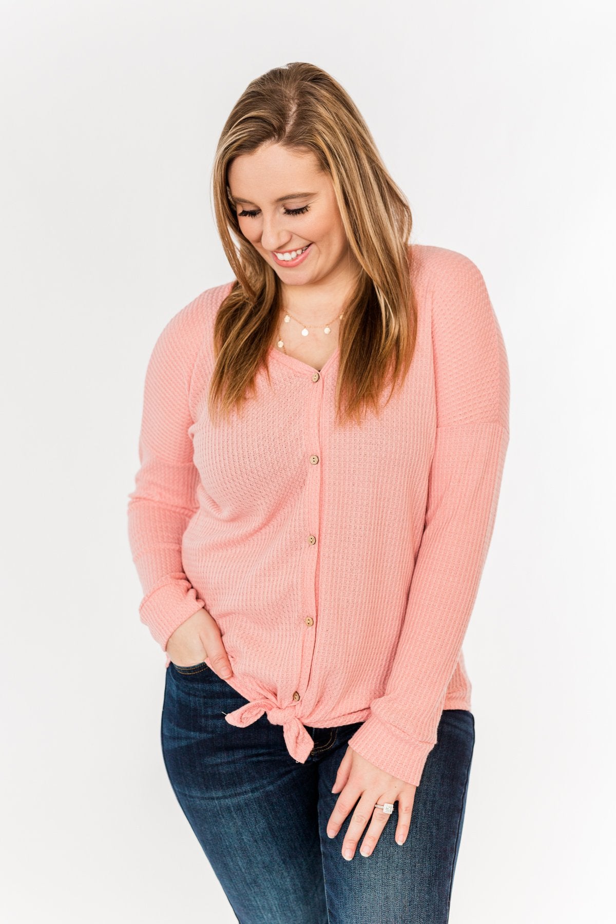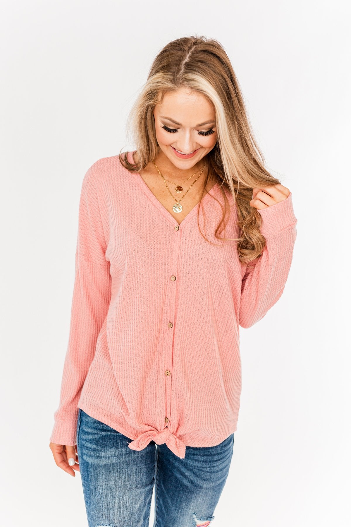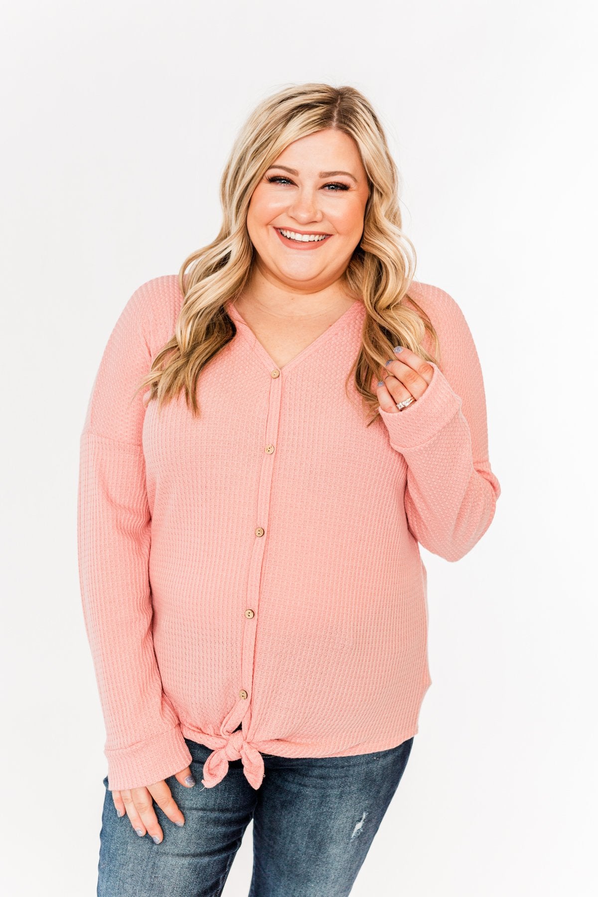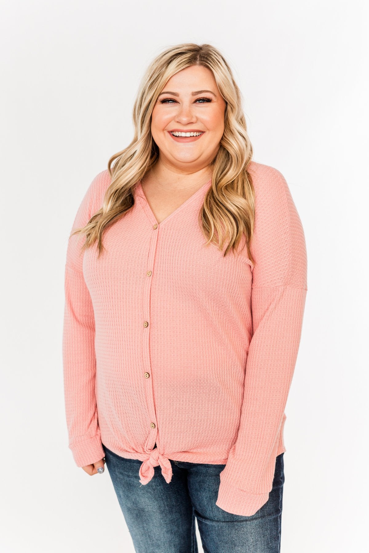 Add a dash of color to your Winter wardrobe with this adorable thermal knit top! This everyday top features a fully functional button down front with a front tie at the bottom on a lightweight, waffle knit material! You're sure to steal glances wherever you go in this simple and sweet top!