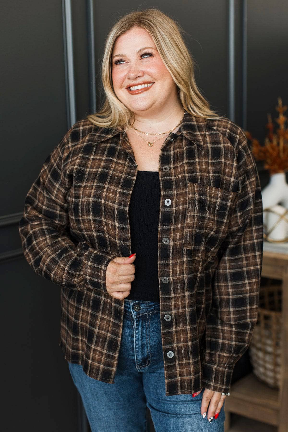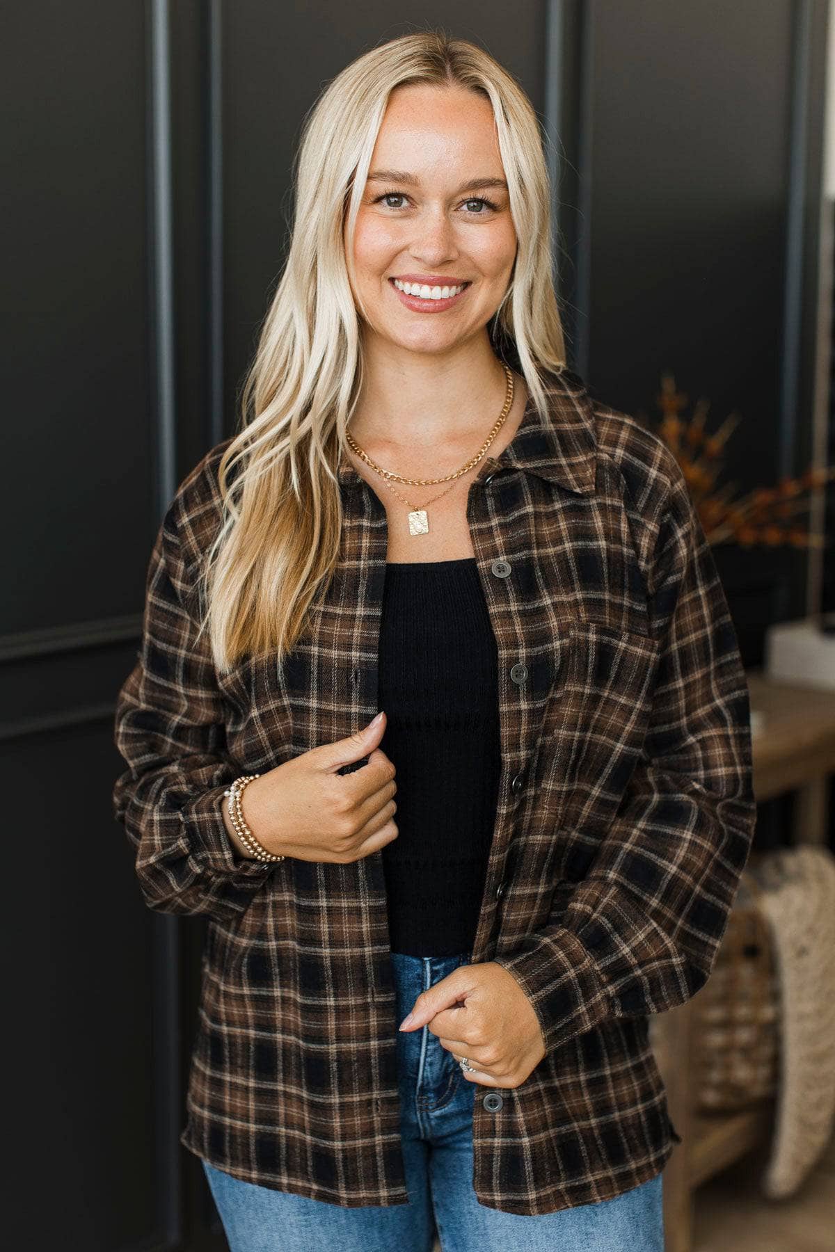 Promises To You Plaid Button Top- Brown