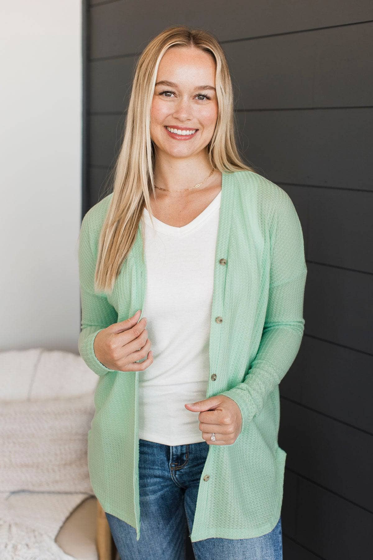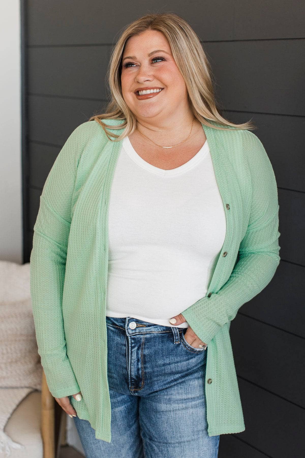 With Reverence Waffle Button Cardigan- Mint