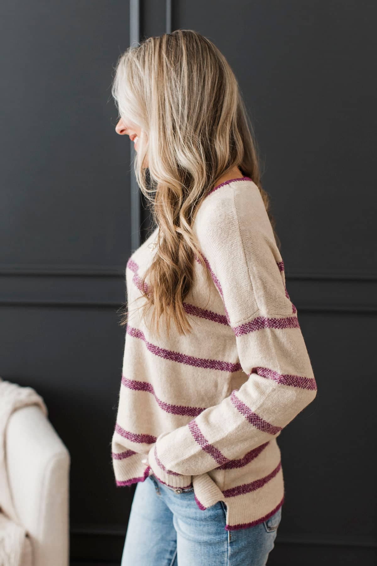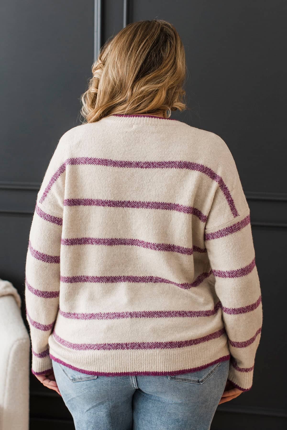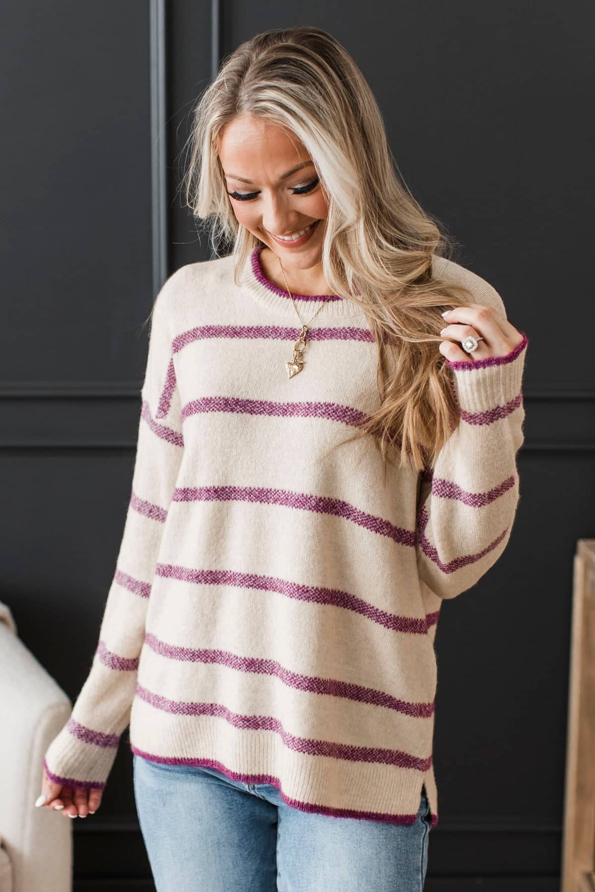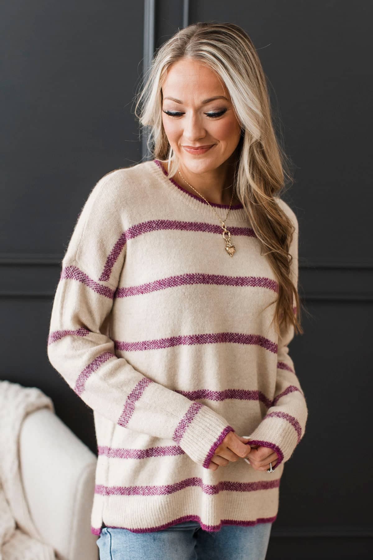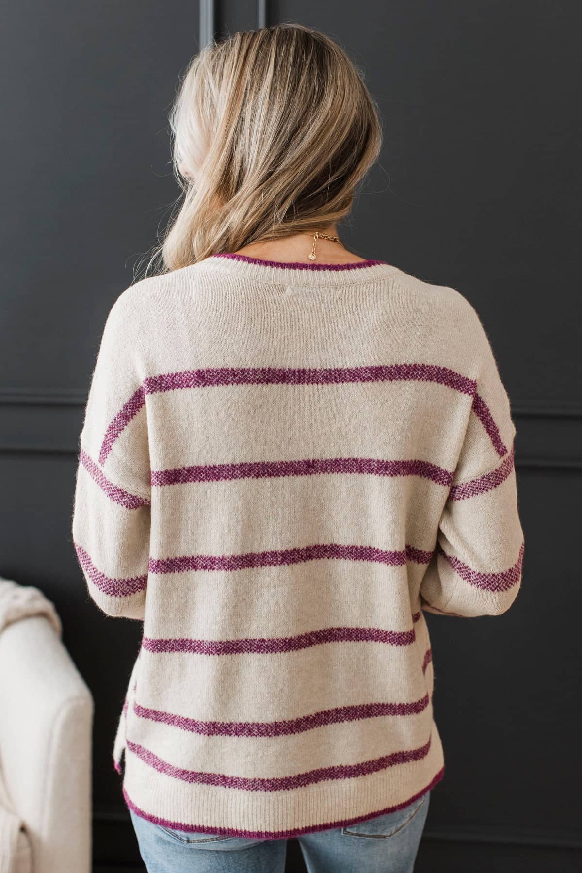 Undivided Attention Striped Sweater- Warm Beige & Magenta