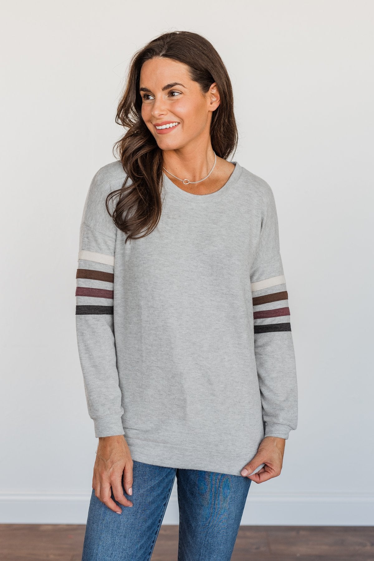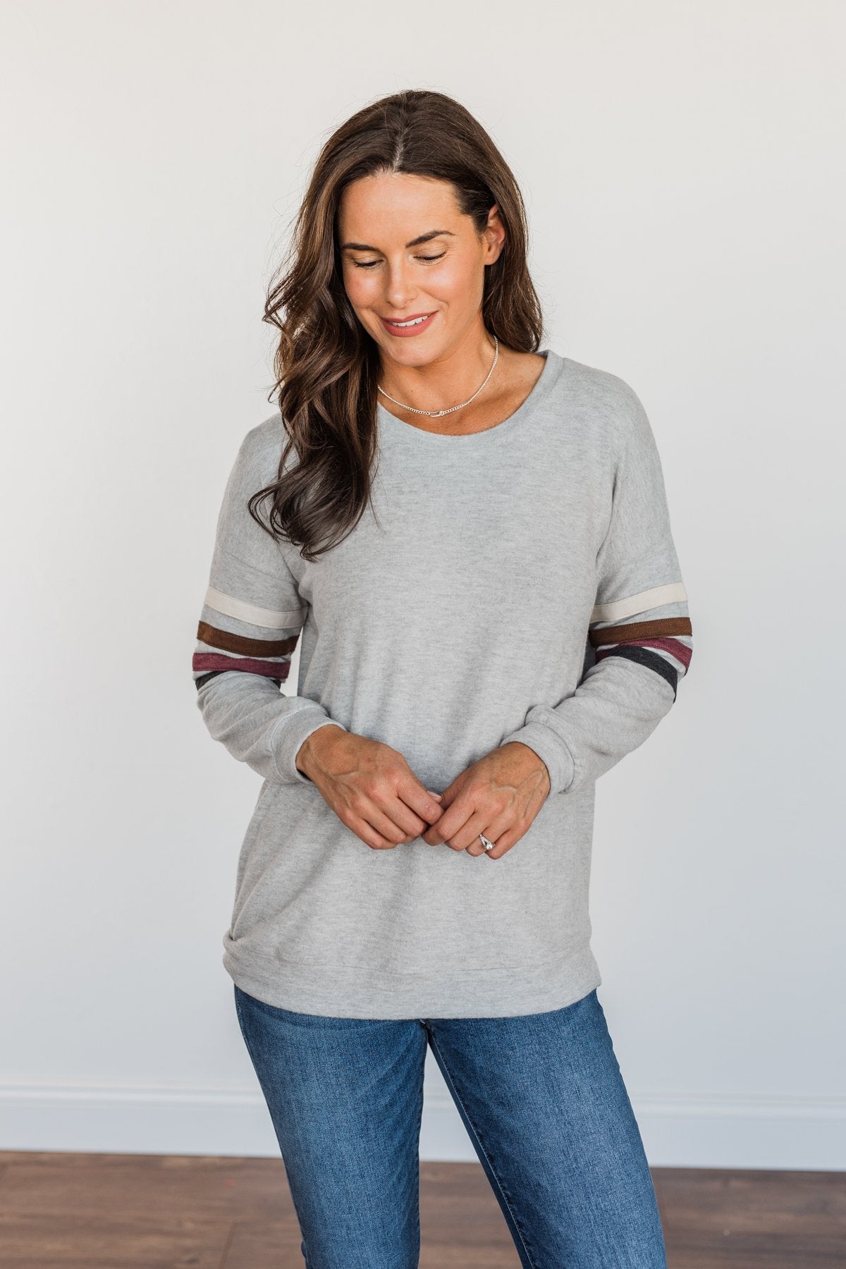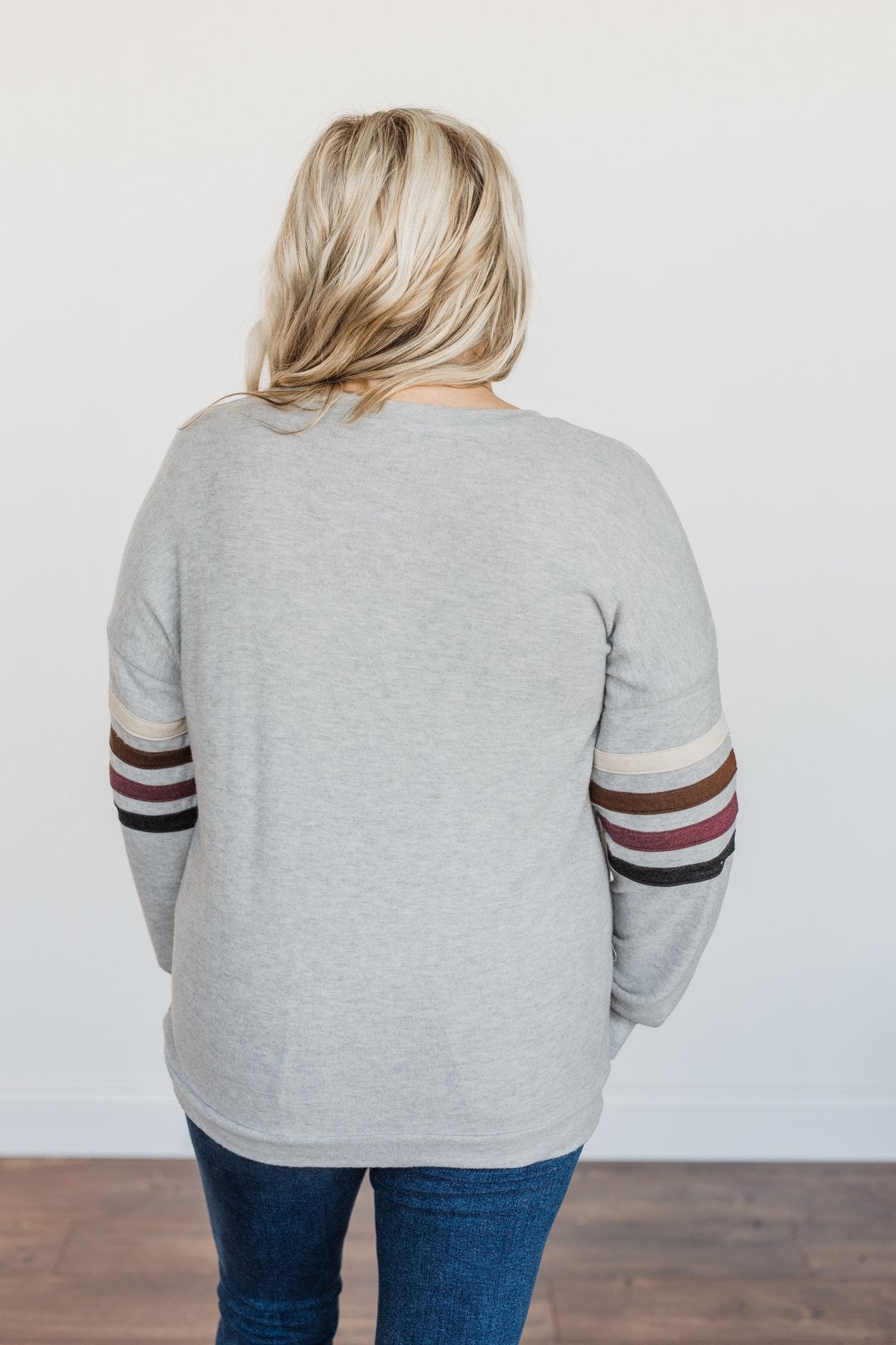Walking Into Autumn Varsity Stripe Top- Light Heathered Grey