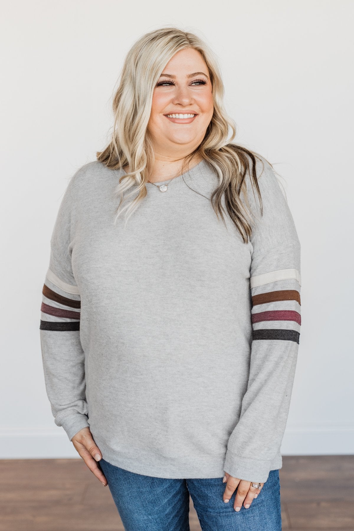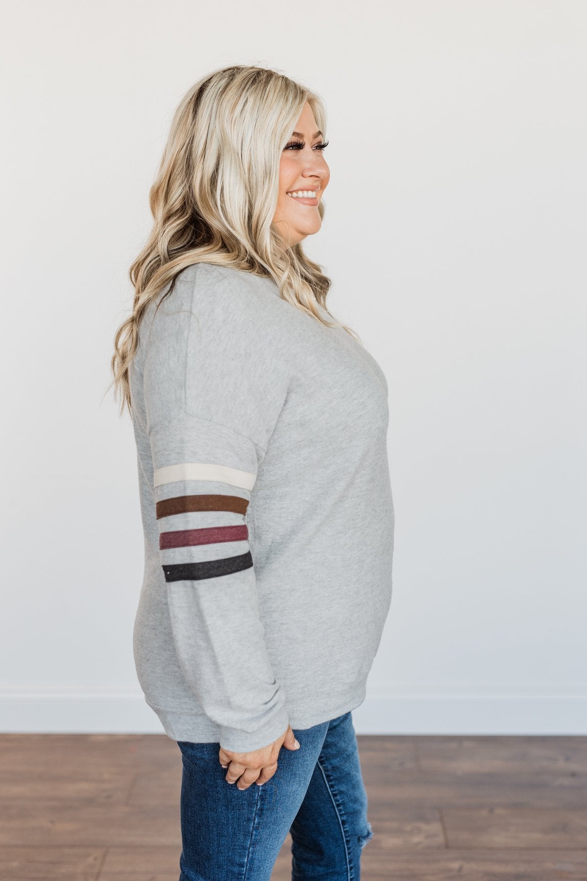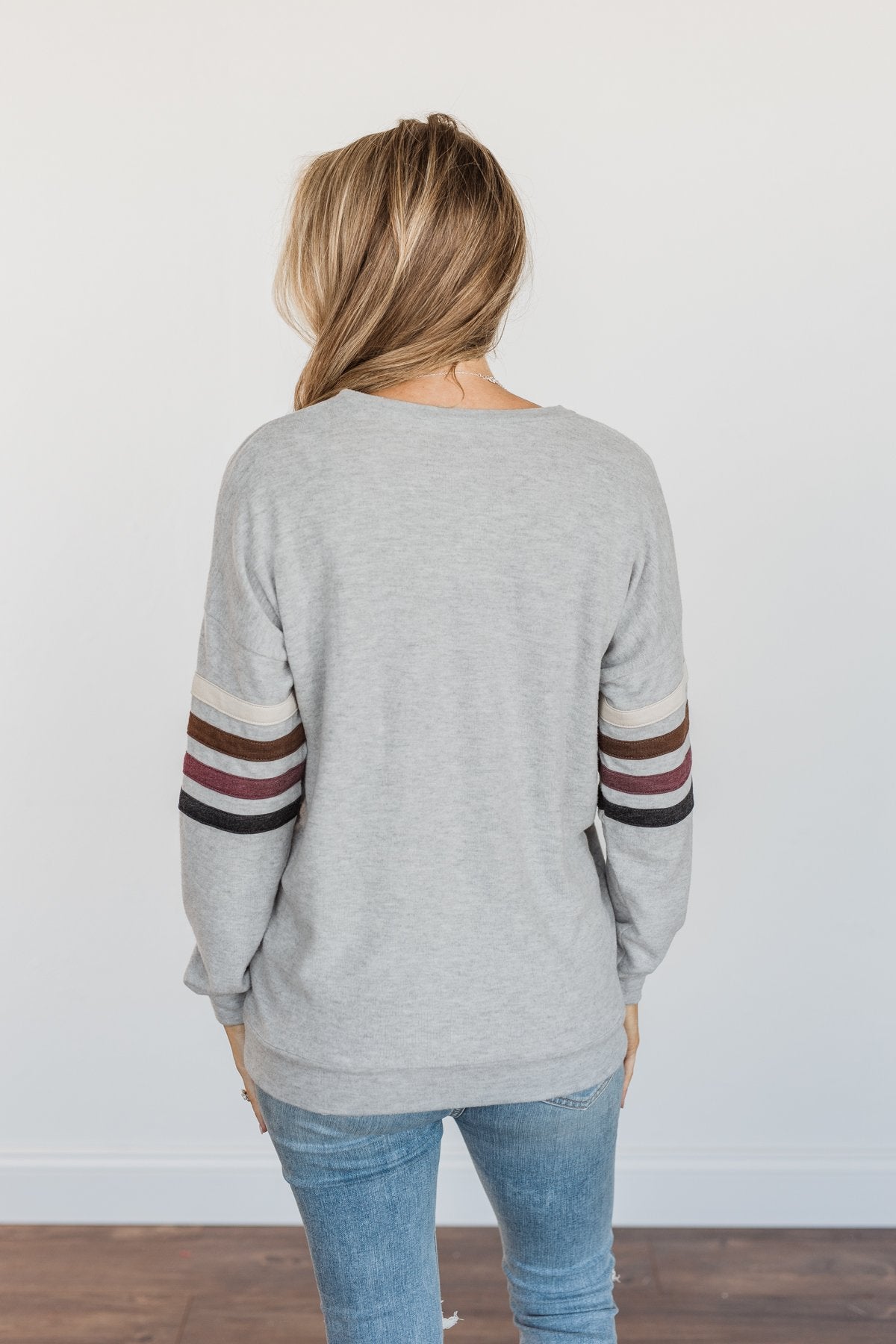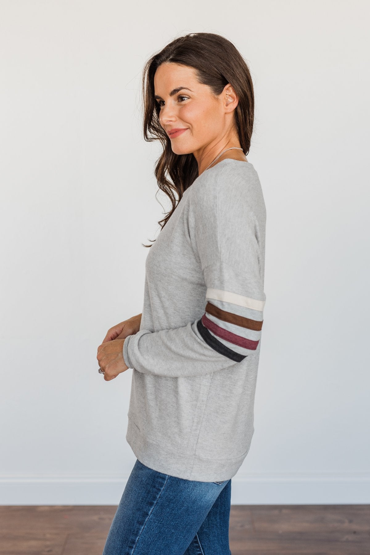 Walking Into Autumn Varsity Stripe Top- Light Heathered Grey